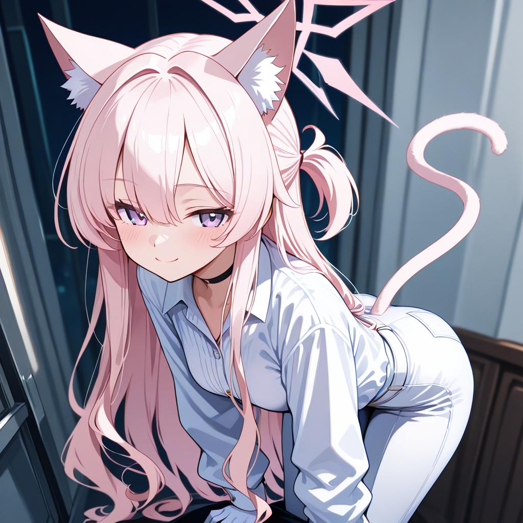 Akira (blue archive), blue archive, 1girl, cat girl, cat ears, animal ear fluff, cat tail, red eyes, hair between eyes, colored eyelashes, long hair, white hair, pink hair, white shirt, white gloves, white pants, halo, pink halo, long sleeves, black choker, by artist takara akihito, illustrious