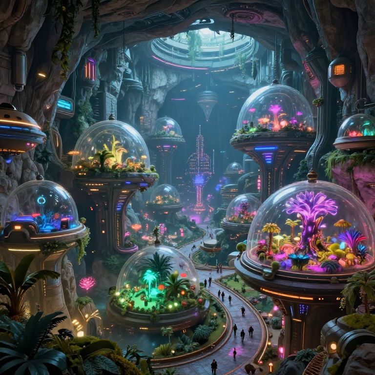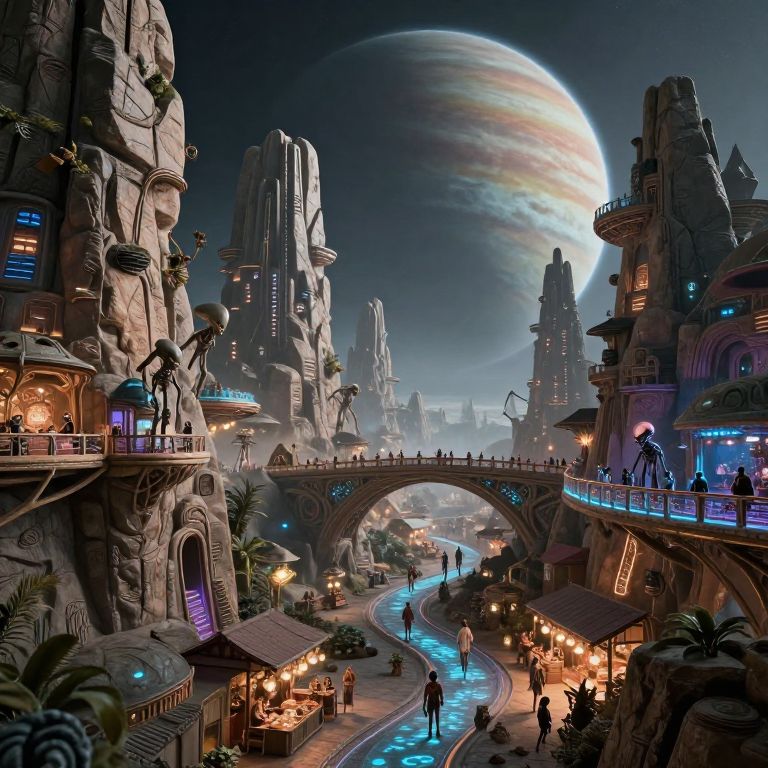 Generate an image of a bustling marketplace in a vibrant alien world, diverse alien species interacting among colorful stalls filled with exotic goods, intricate architecture blending organic and technological designs, lively and rich in detail, sci-fi art style.