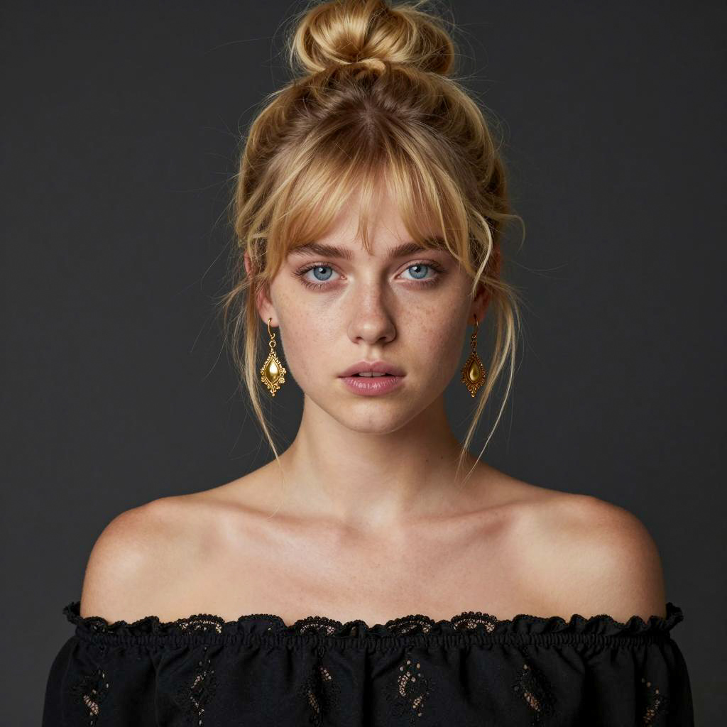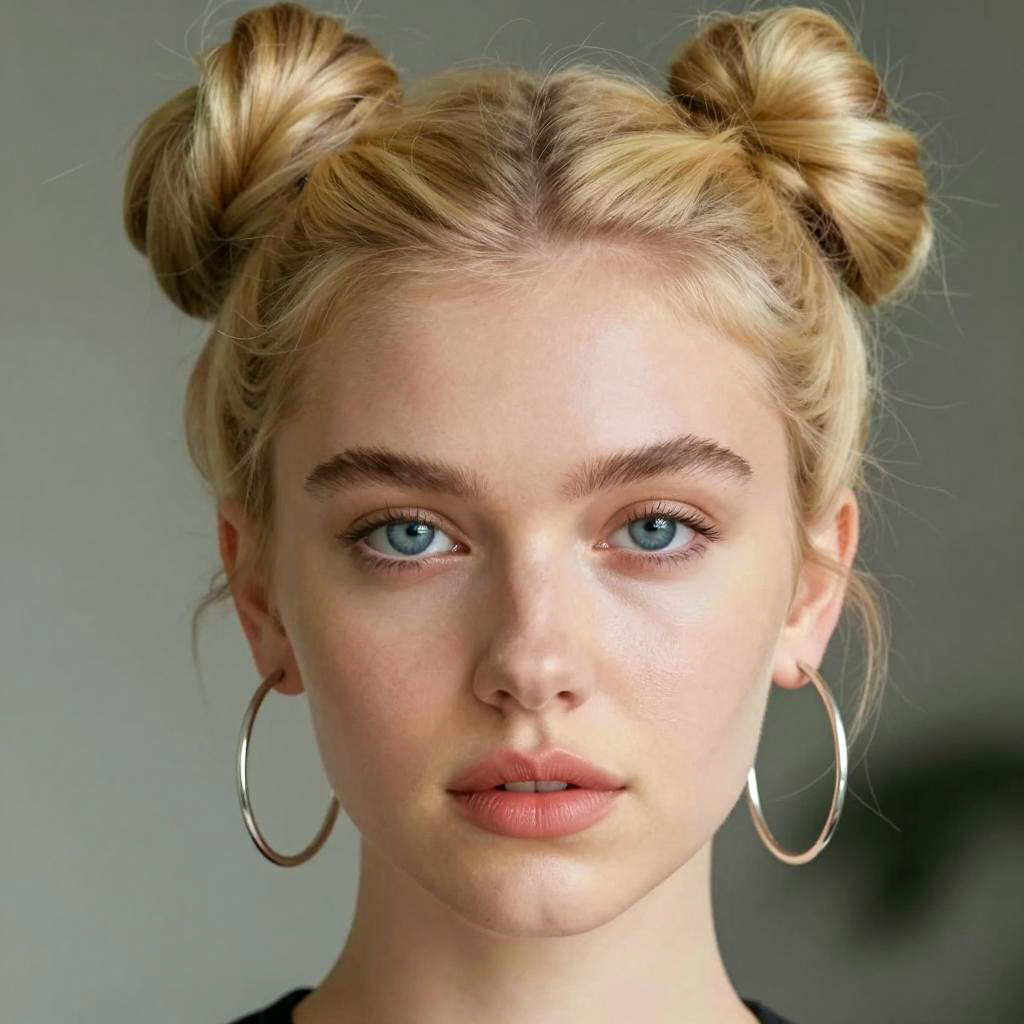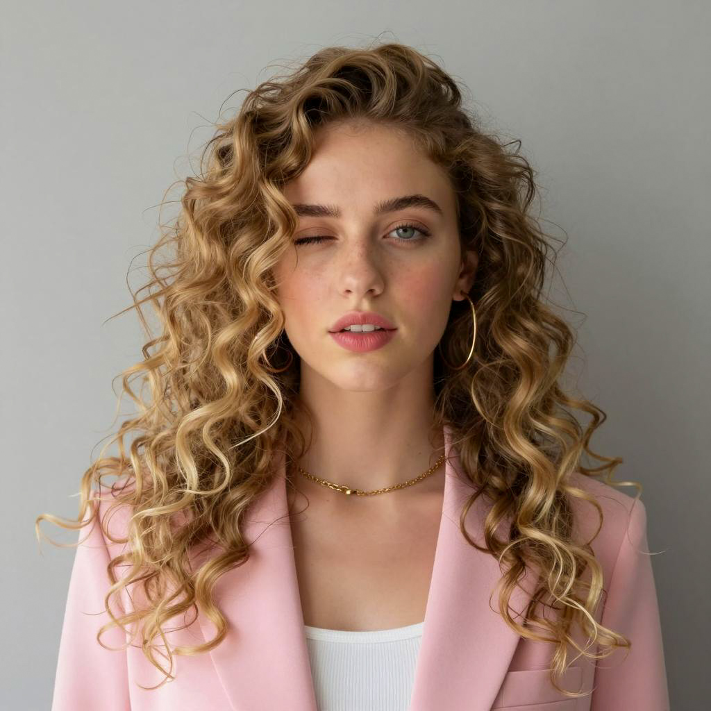Photograph of a young woman with light skin and blonde hair in a messy bun. She wears a pink leather jacket with fringe, gray sweater, pearl necklace, and large pearl earrings. Gray wall background. She has full lips, light pink lipstick, and a neutral expression. Shoulder bag strap visible on her right. Light makeup with subtle pink blush and light eye makeup.