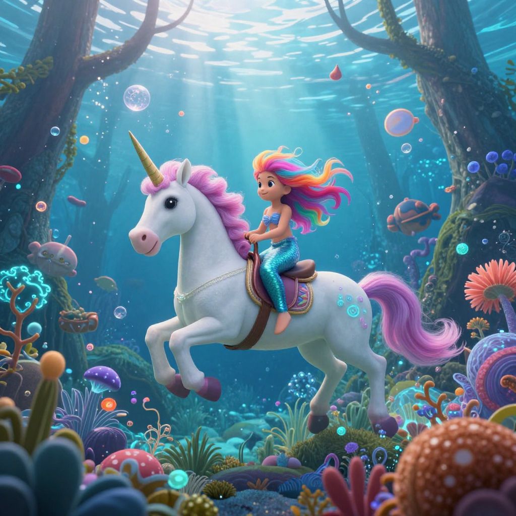 An enchanting digital artwork captures a magical scene where a young mermaid with vibrant multicolored hair rides atop a majestic unicorn through an underwater forest. From a 'bubble-eye view', we see the vivid, colorful flora and fauna surrounding them, glowing with luminescent patterns as they navigate through the crystal-clear waters. The mood is filled with wonder and joy, with the soft light from sunken treasure illuminating their journey, creating a mesmerizing and whimsical atmosphere that perfectly encapsulates the essence of childhood dreams.