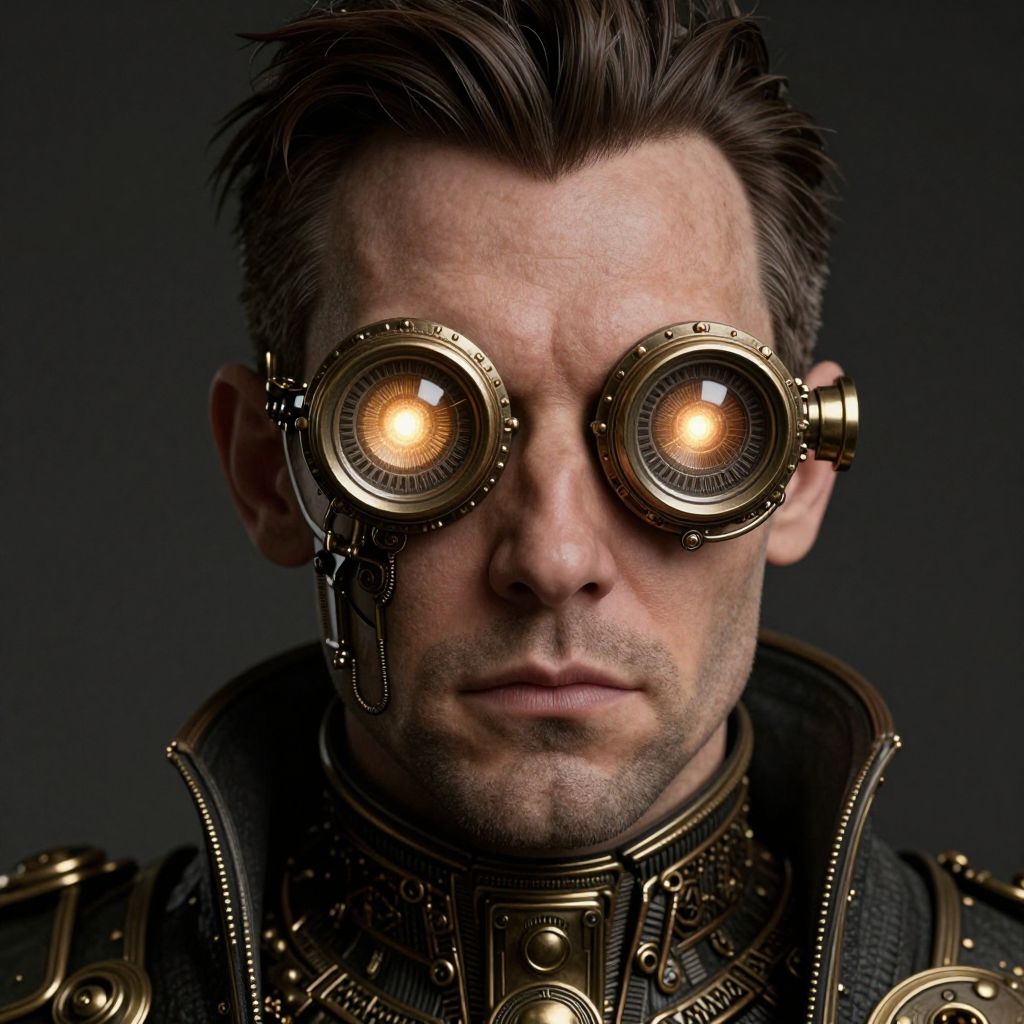 A detailed steampunk-style portrait of a man with glowing, mechanical eye pieces.