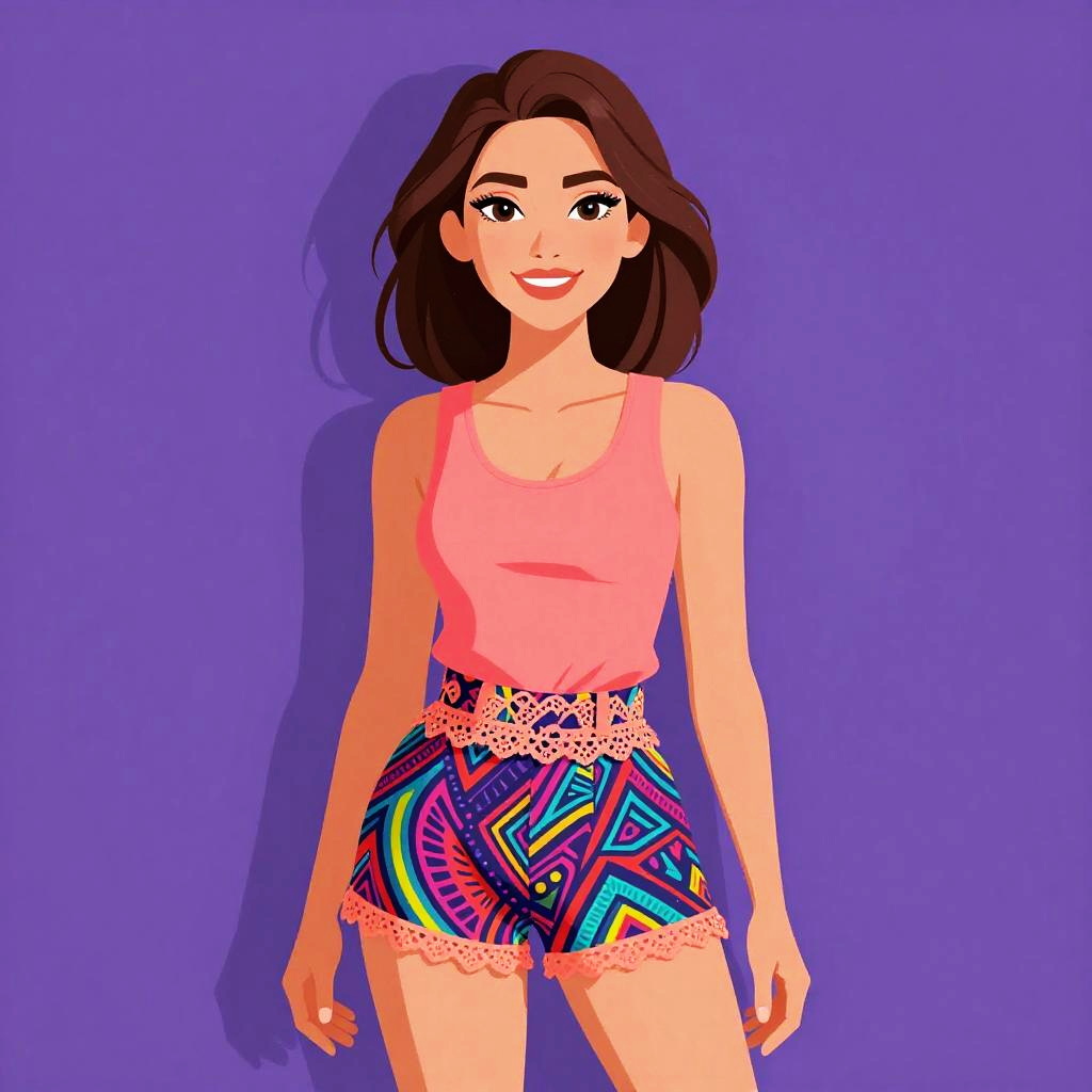 Illustration of a young woman with medium skin tone and brown hair, smiling confidently against a purple background. She is wearing a sleeveless coral pink blouse with a rounded neckline and high-waisted shorts featuring a bold multicolored tribal print, accented with ornate peach lace detailing at the waist and hem.