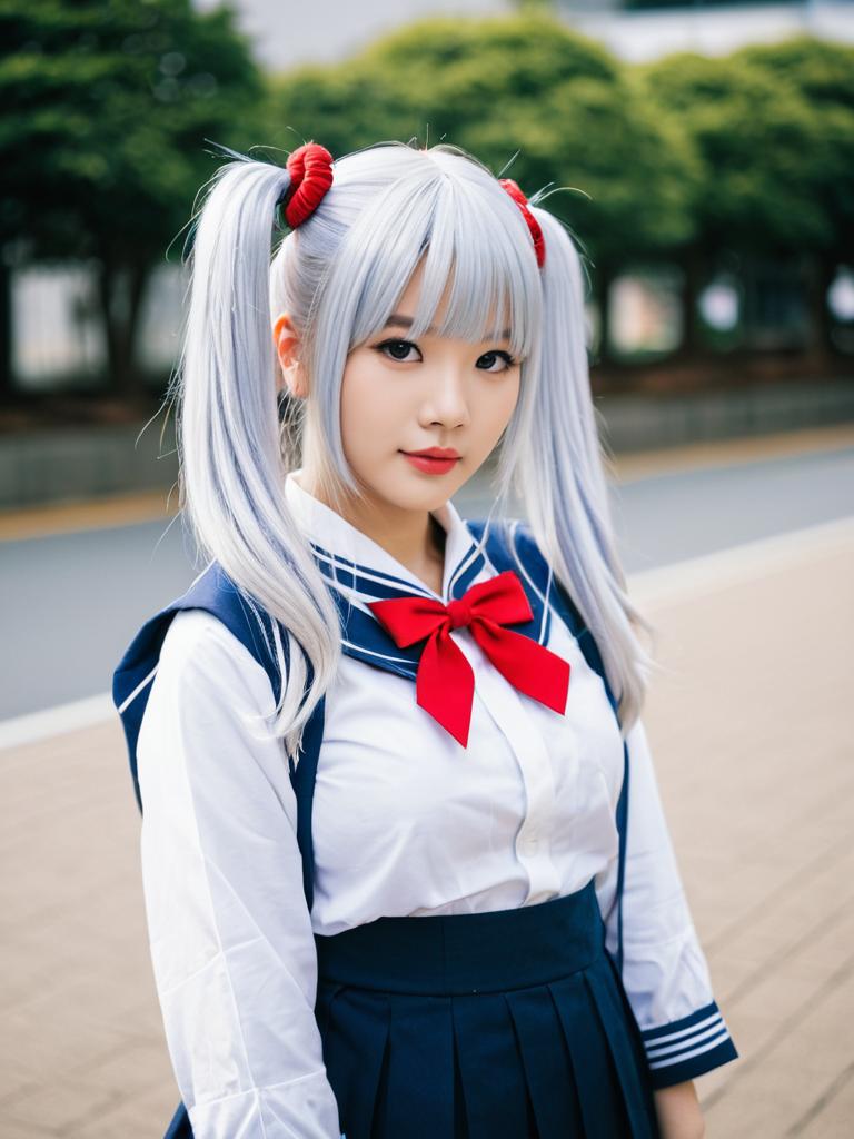 Photo-realistic cosplay photo of person in arashi chisato costume. 1girl, red eyes, white hair, long hair, double bun, blunt bangs, twintails, yuigaoka school uniform, single sidelocklifestyle stock photo, shallow depth of field, lifestyle stock photography, shallow depth of field, natural lighting, warm tones, soft background blur, candid moments, vibrant colors, realistic textures, modern casual clothing. full body shot