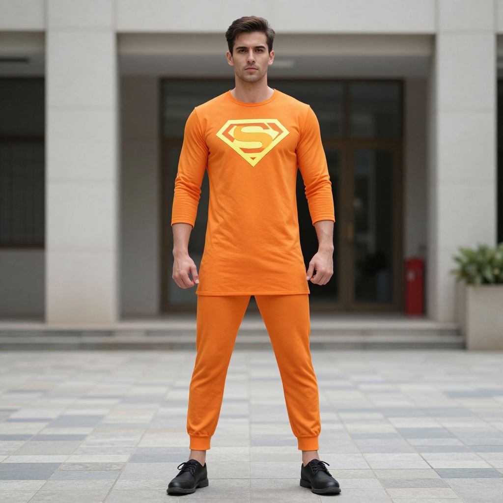 Photograph of a young man standing in a paved courtyard. He has short, dark hair and a serious expression. He is wearing a bright orange long-sleeve shirt with a large, yellow Superman logo on the chest, and matching orange pants that are slightly baggy. He has black sneakers on his feet. The background shows a modern building with large windows and a red fire extinguisher to the right. The pavement has a checkered pattern of gray and white tiles. The overall style is clean and contemporary, with a focus on the vibrant orange outfit.
