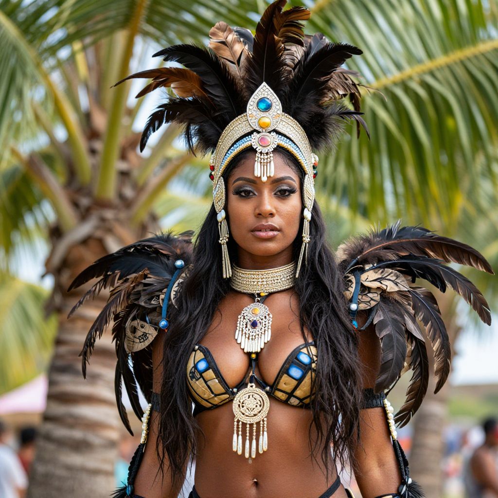Caribana festival costume, 1girl, dark skin, dark-skinned female, feathers, jewelry, headdress, solo focus, long hair, solo, tribal, outdoors, tree, palm tree, midriff