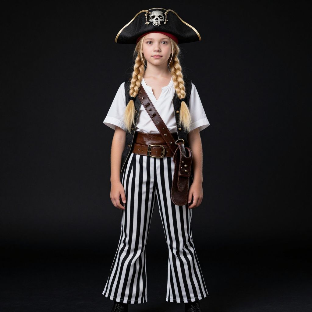 Photograph of a young blonde girl with braided hair, wearing a pirate hat, white shirt, brown belt, and black-and-white striped pants,