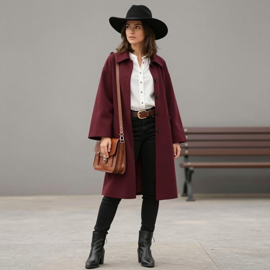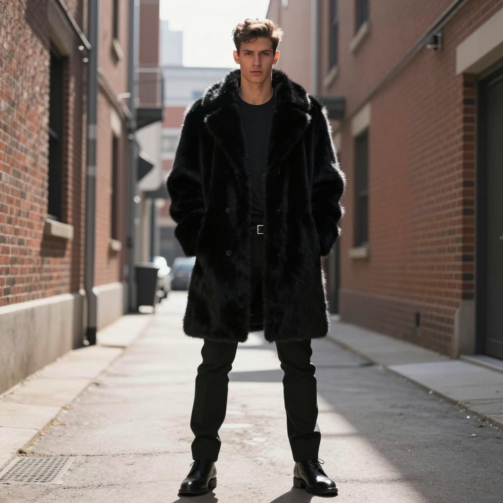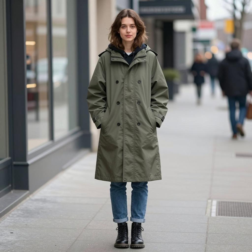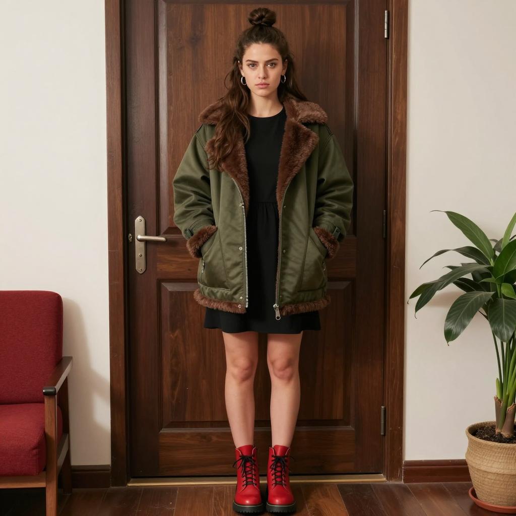 Fur trim coat costume, photograph of a young woman standing outdoors, full body shot, wearing an orange fur-trimmed coat, hands in pockets, light brown hair, serious expression, tan turtleneck sweater, grey pants, brown lace-up boots, daytime, sunlight casting shadows, urban background, large dark door behind her, stone pavement, realistic style, casual fashion, winter clothing, warm coat, fur trim detail, neutral background, natural lighting