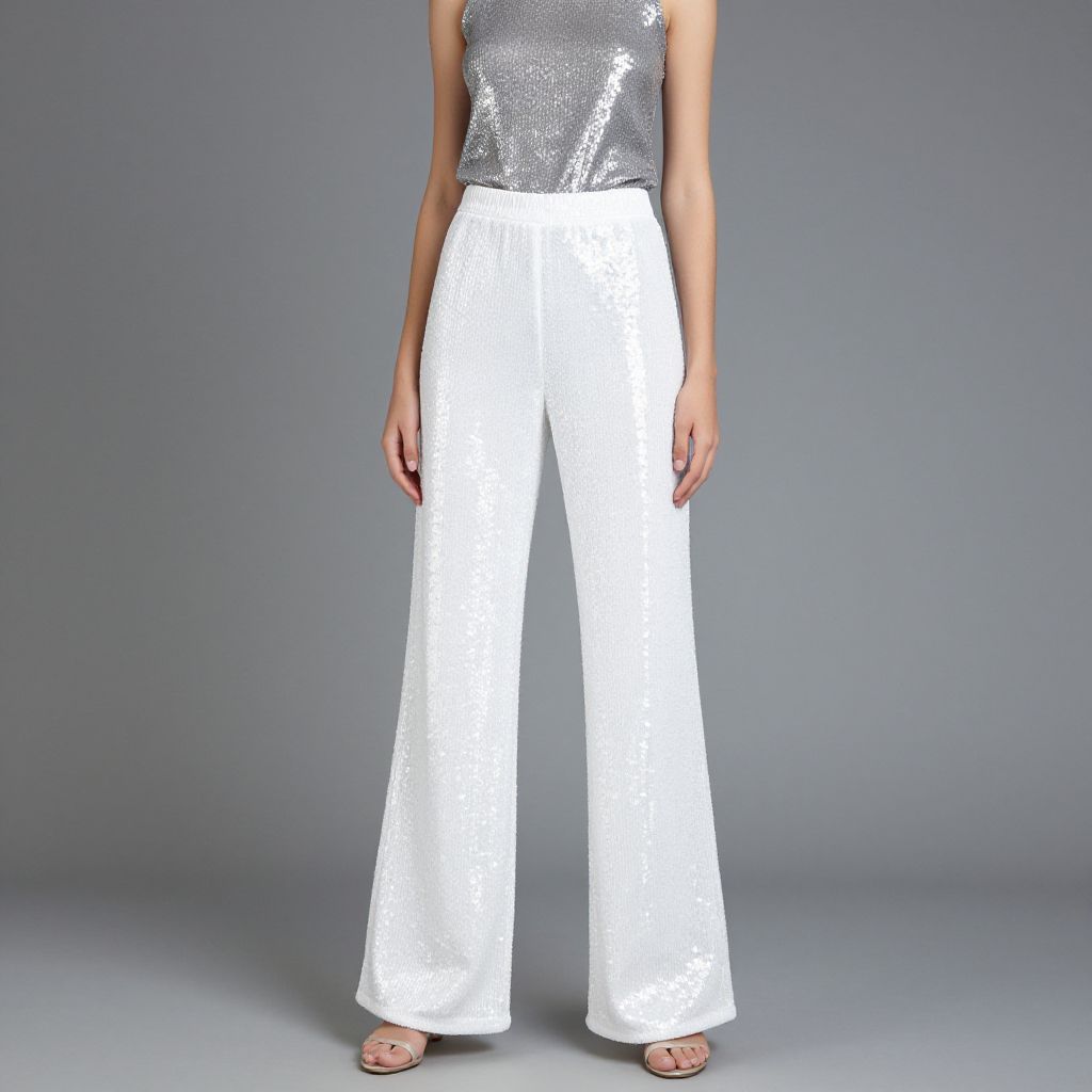Photograph of a person standing against a plain gray background. The subject is wearing a sleeveless, silver sequined top and high-waisted, white, wide-leg pants with a subtle textured pattern. Their arms are relaxed at their sides, and they are wearing open-toed, pink sandals. The image focuses on the outfit from the waist down, with no facial features visible. The lighting is even, highlighting the shimmer of the top and the crisp white of the pants. The overall style is modern and chic.