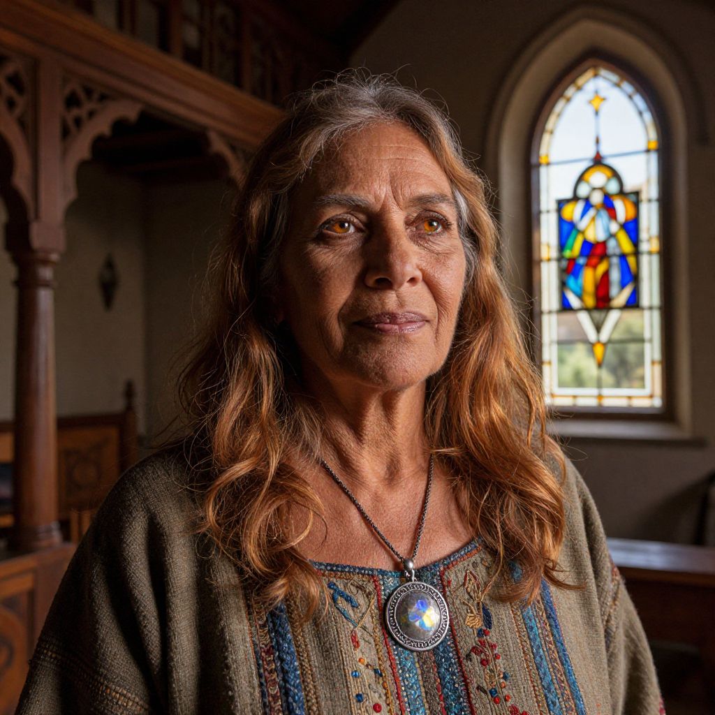 Craft a photorealistic portrait of an Aboriginal woman in her middle years, featuring contemplative amber eyes and wavy chestnut hair. Bathe her in warm afternoon sunlight streaming through an arched church window. Capture the subtle transition from introspection to a gentle smile, amidst rustic surroundings adorned with intricate woodwork and celestial stained glass. Emphasize the interplay of light and shadow on her face, revealing fine lines that narrate a life's journey. Showcase the rich textures of her antiquated linen dress and an antique silver pendant necklace, which gleams with ethereal radiance. Ensure this enigmatic yet inviting subject captivates viewers.