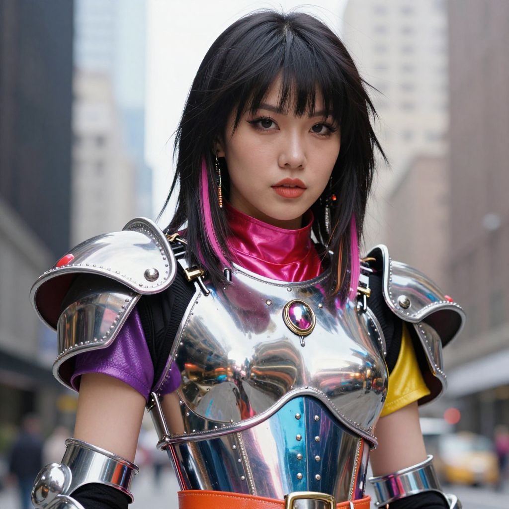 Bump Map asian female in armor standing in the city, in the style of storm thorgerson, queercore, 1980s, close-up, tsubasa nakai, the new york school, colorful costumes, liquid metal,