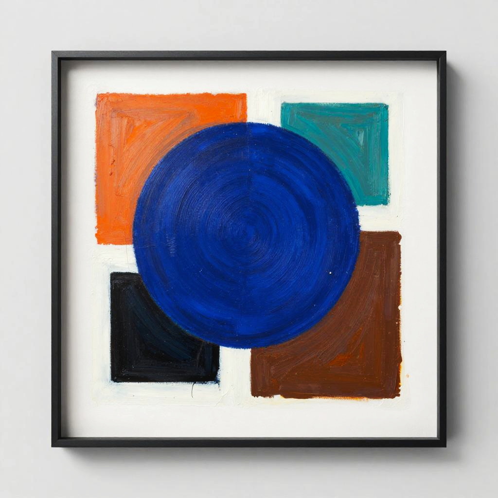 Abstract painting with a large blue circle, surrounded by orange, black, teal, and brown squares, framed in black, on white background.