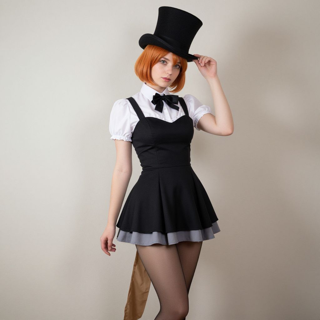 Full-body portrait of a young woman with vivid red hair and emerald green eyes. She is dressed in a sleek green cosplay dress with puffed sleeves, a black corset belt, a white ruffled collar, and tall black boots. The image is captured in a professional studio with clean white background and real lighting, producing a high-definition, realistic effect.