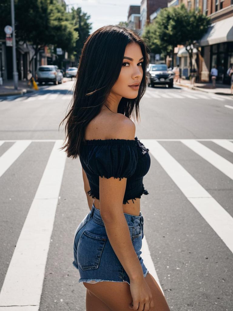 Woman looking at camera, sideview, wearing ultra-short distressed high-waisted denim Daisy Duke shorts and off-the-shoulder smocked crop top in classic blue Daisy Duke shorts with yellow top on tall woman with loose curls and golden highlights posed turning at the crosswalk with body facing away and face toward camera in suburban neighborhood street with low houses and palm trees, strong overhead sun with reflective ground bounce, cinematic summer street-style fashion photography, high resolution, ultra-detailed