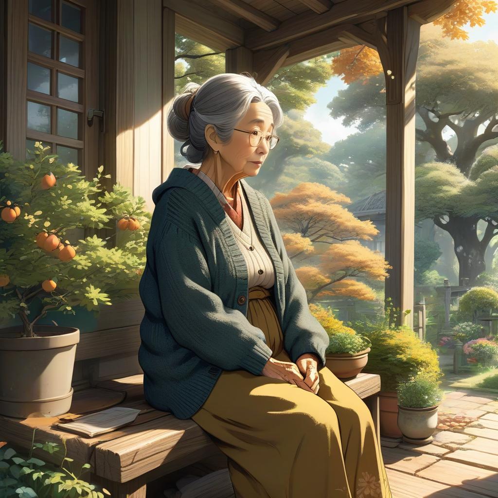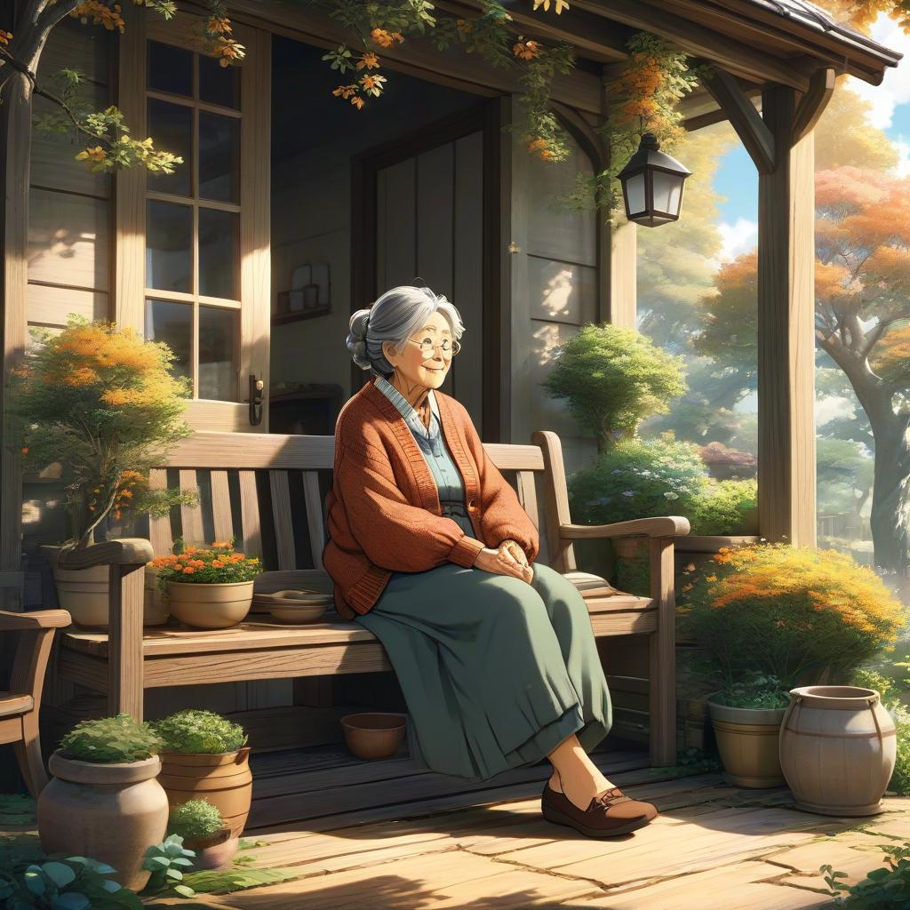 A nurturing grandmother, wearing a warm cardigan and comfy pants, surrounded by growing oak trees, in a homely cottage porch, illustrated in the heartfelt and gentle anime style of Natsuki Takaya.