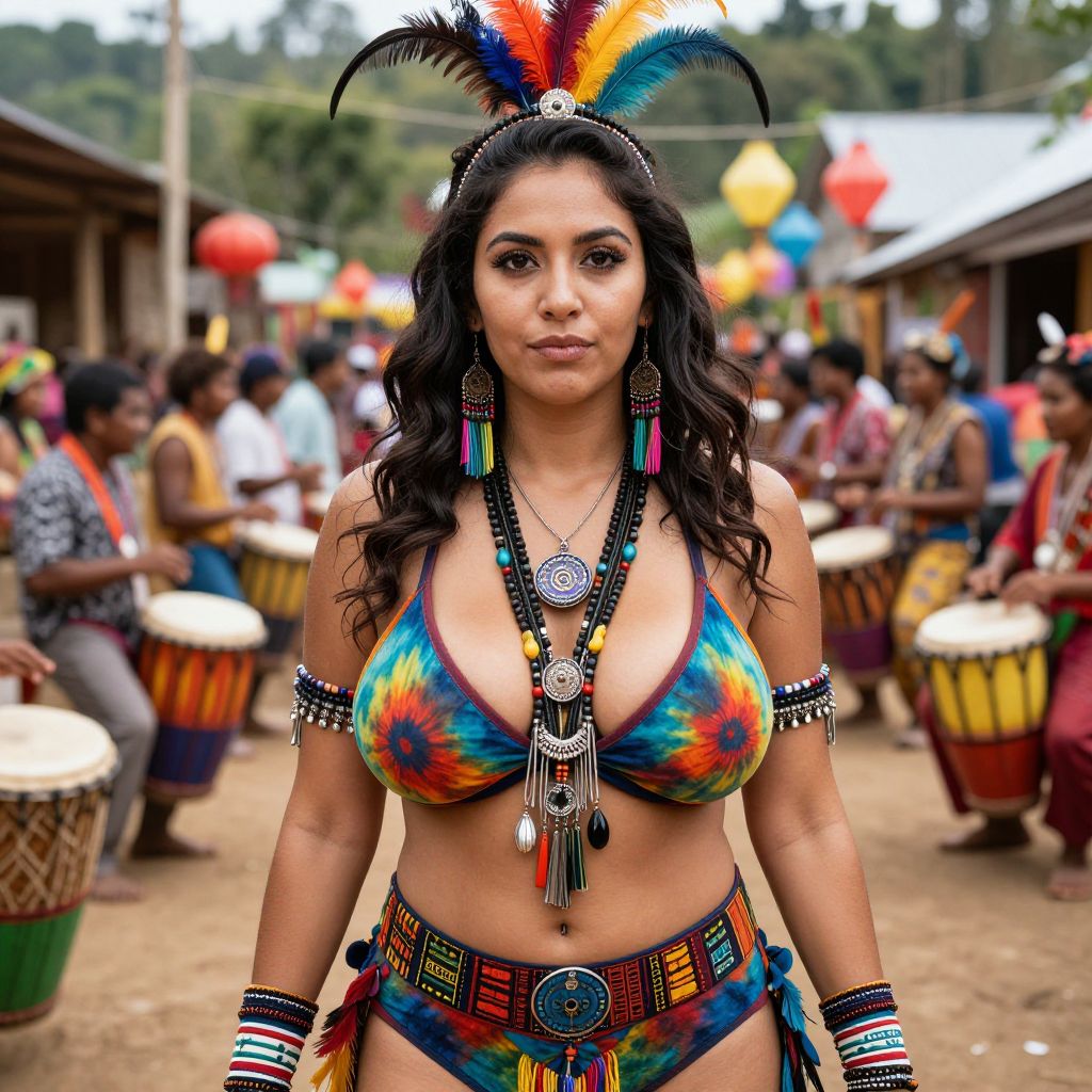 Photograph of a confident Indian woman with medium brown skin and long, wavy black hair, wearing a colorful tie-dye bikini top and matching bottoms. She is adorned with intricate beadwork, silver jewelry, and a headpiece with vibrant red, yellow, and blue feathers. She stands in the foreground of a festive outdoor scene, surrounded by drummers in traditional attire and colorful balloons in the background. The dirt ground and rustic buildings suggest a cultural festival or celebration. Her large, expressive eyes and neutral expression are prominent. The image is vivid and colorful, emphasizing cultural heritage and celebration.