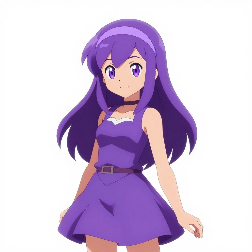 Portrait, solo, 1girl, (white background, simple background), hex maniac \(pokemon\), purple hair, purple eyes, headband, purple dress