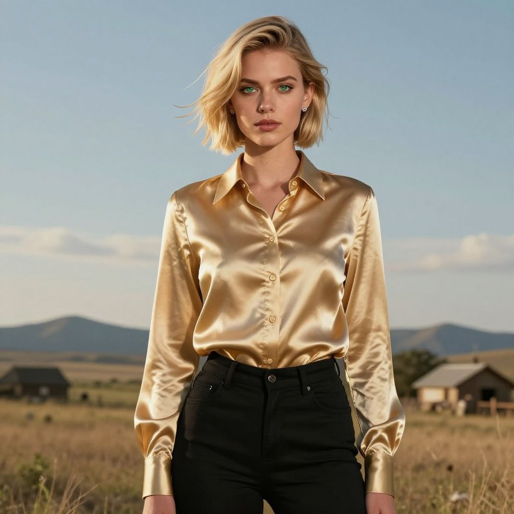 Photograph of a blonde woman with light skin and blue eyes, standing in a sunlit, rural field with mountains in the background. She has shoulder-length, slightly windswept hair and is wearing a shiny, gold satin blouse with black high-waisted pants. Her expression is serious, and she is looking directly at the camera. The blouse's glossy texture contrasts with the matte finish of her pants. The background features a clear blue sky and a few distant buildings. The lighting emphasizes the golden hue of her blouse, adding a glamorous touch to the rustic setting.