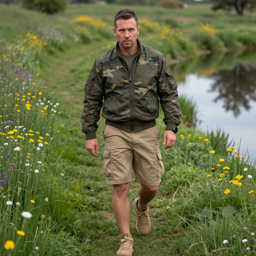 A man stands confidently in a lush, green forest, surrounded by vibrant foliage and a breathtaking waterfall cascading in the background. His striking green leather jacket complements the natural surroundings, creating a harmonious blend of style and nature. This captivating scene exemplifies adventure and exploration in an enchanting wilderness setting.