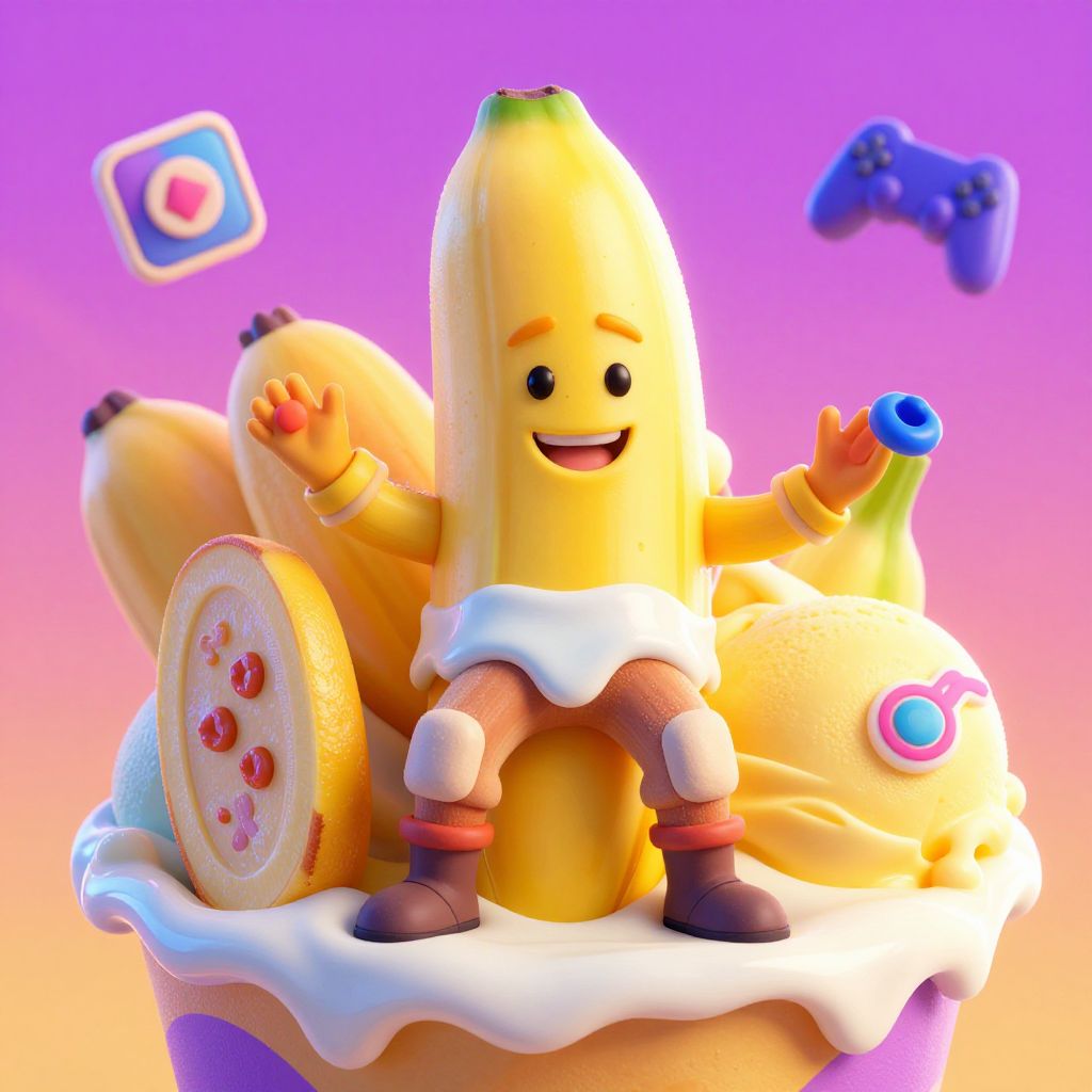 CGI image of a cheerful anthropomorphic banana character with a bright yellow peel, wearing brown boots and a white scarf, sitting on a white, fluffy base surrounded by sliced bananas and a banana-shaped object. The character has black eyes, a smiling mouth, and raised arms. In the background, there's a floating game controller and a pink and blue square icon. The gradient background transitions from pink to purple, adding a vibrant, playful atmosphere. The image has a cartoonish, 3D digital art style.