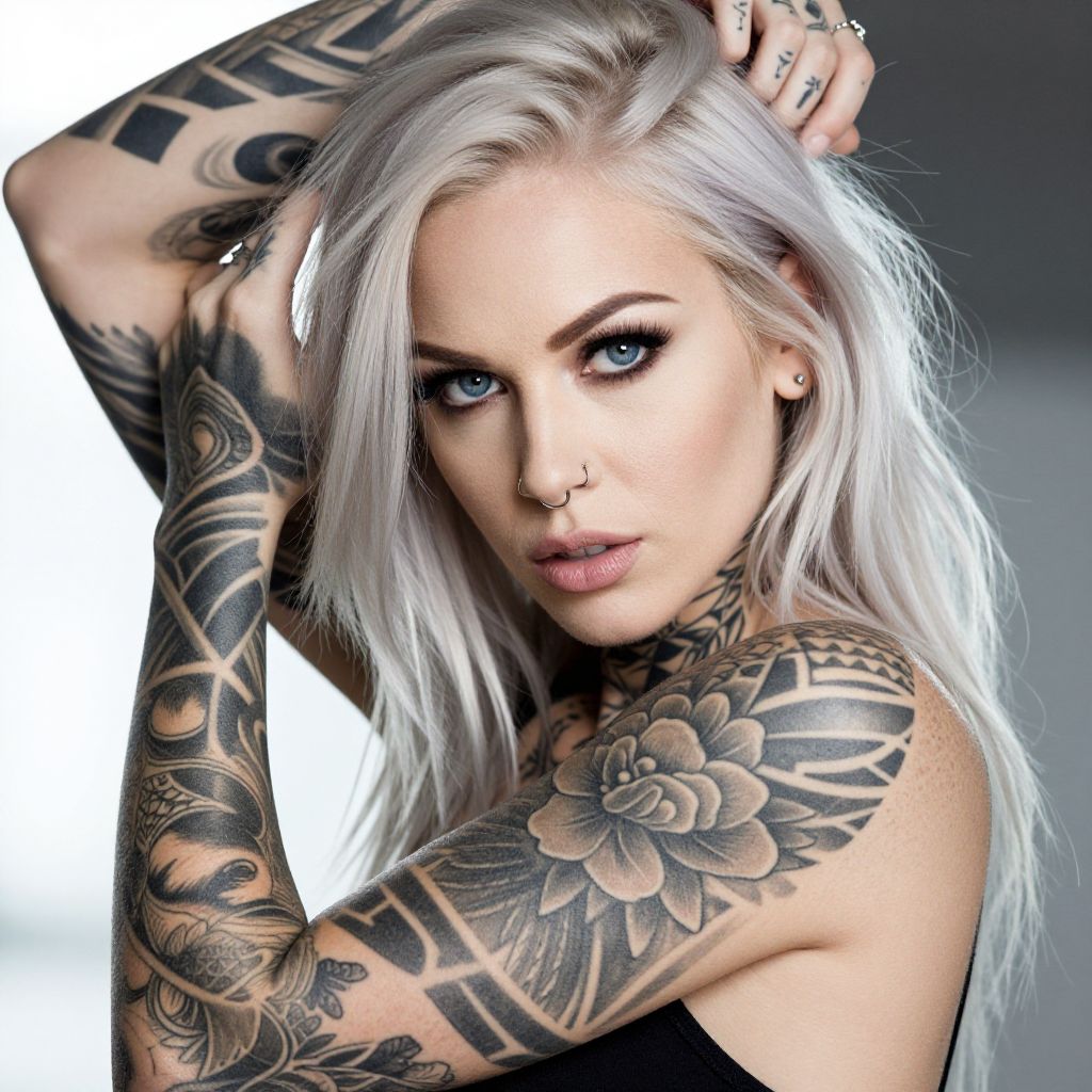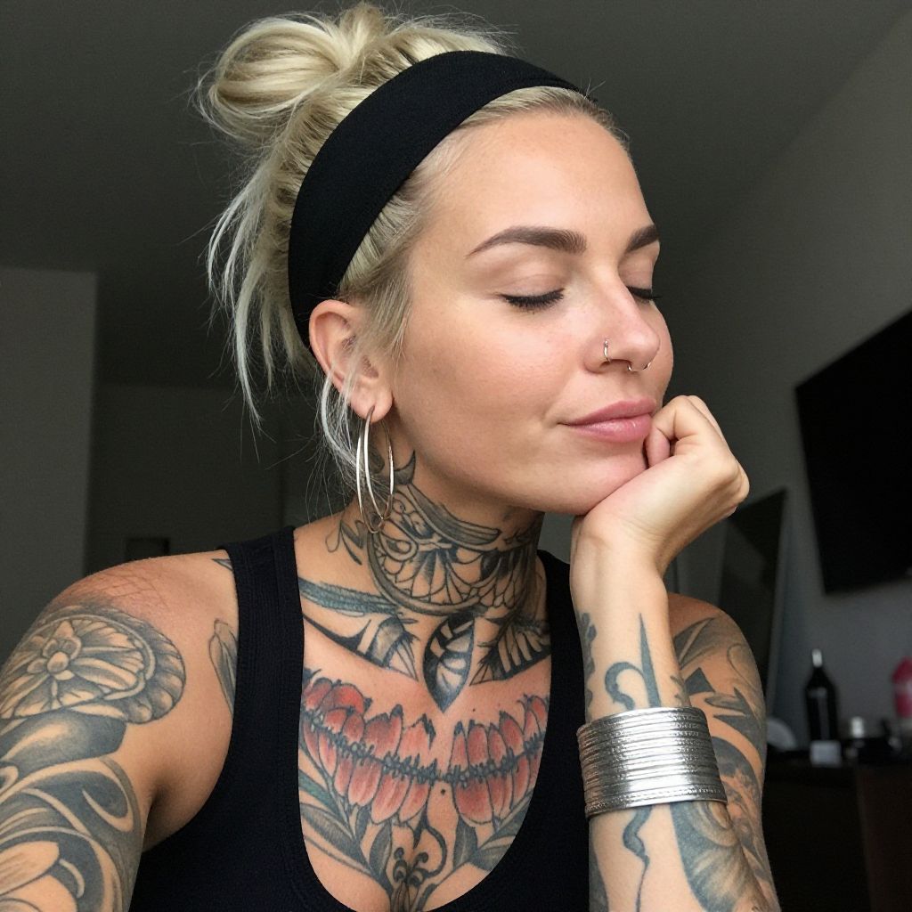 Photograph of a blonde woman with her hair in a messy bun, showcasing extensive tattoos covering her neck, chest, and left arm. She's wearing a black tank top, hoop earrings, a nose ring, and a black headband. Her right hand, adorned with intricate silver and blue tattoos, rests near her chin. The background is a dimly lit room with a wooden chair and hanging light fixtures.