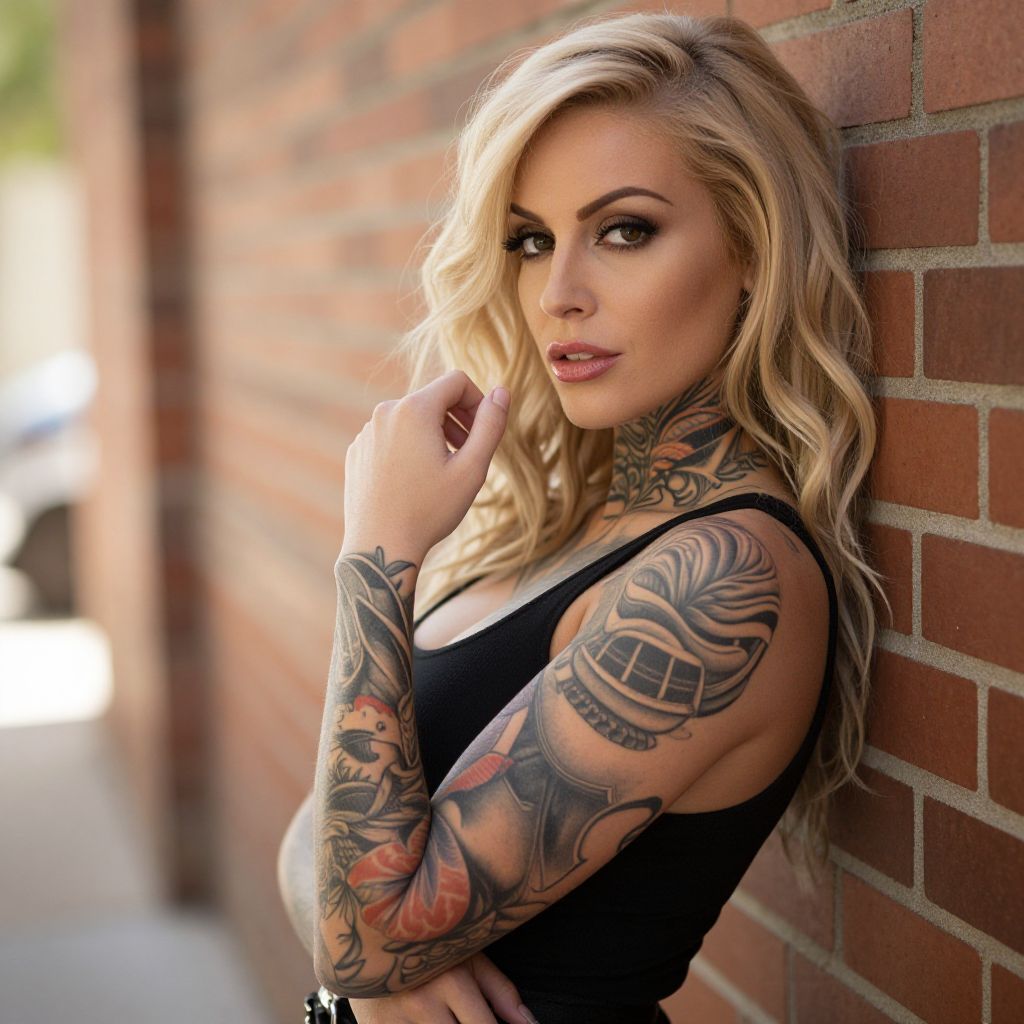 Photograph of a blonde woman with a ponytail, black tank top, extensive tattoos, nose ring, hoop earrings, and thinking pose in a dim