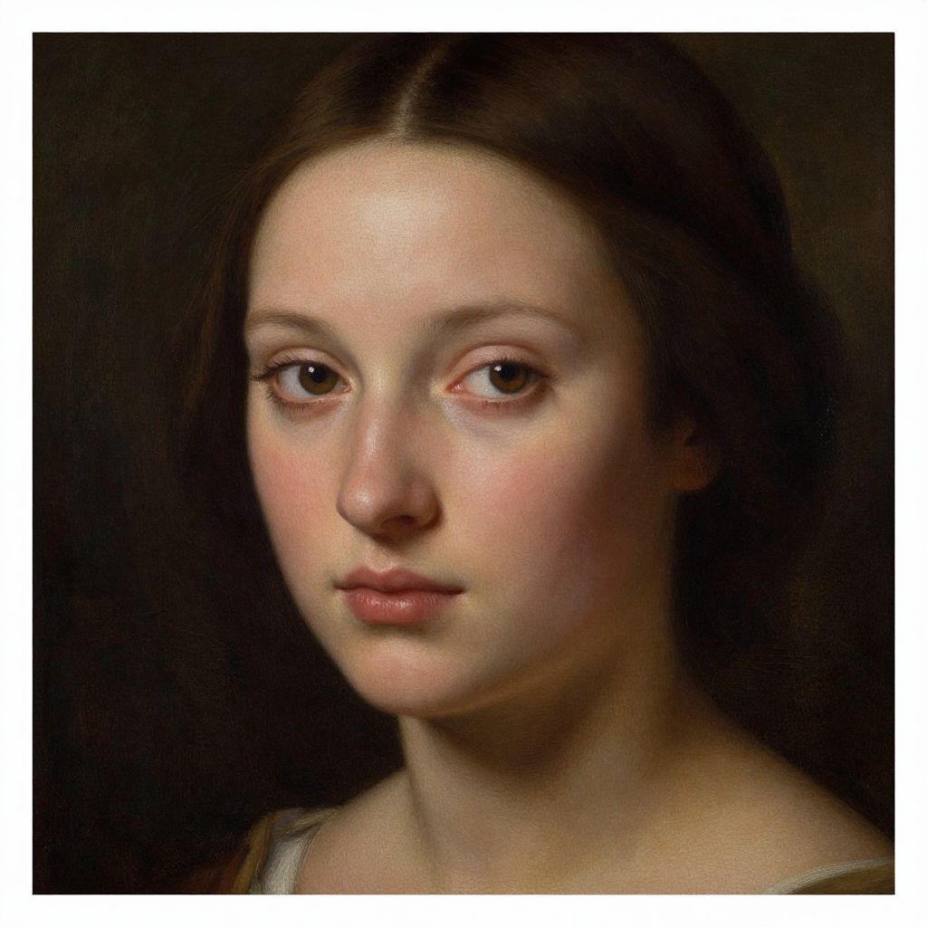 Photorealistic digital painting of a young woman with fair skin, brown eyes, and dark brown hair, set against a dark background.