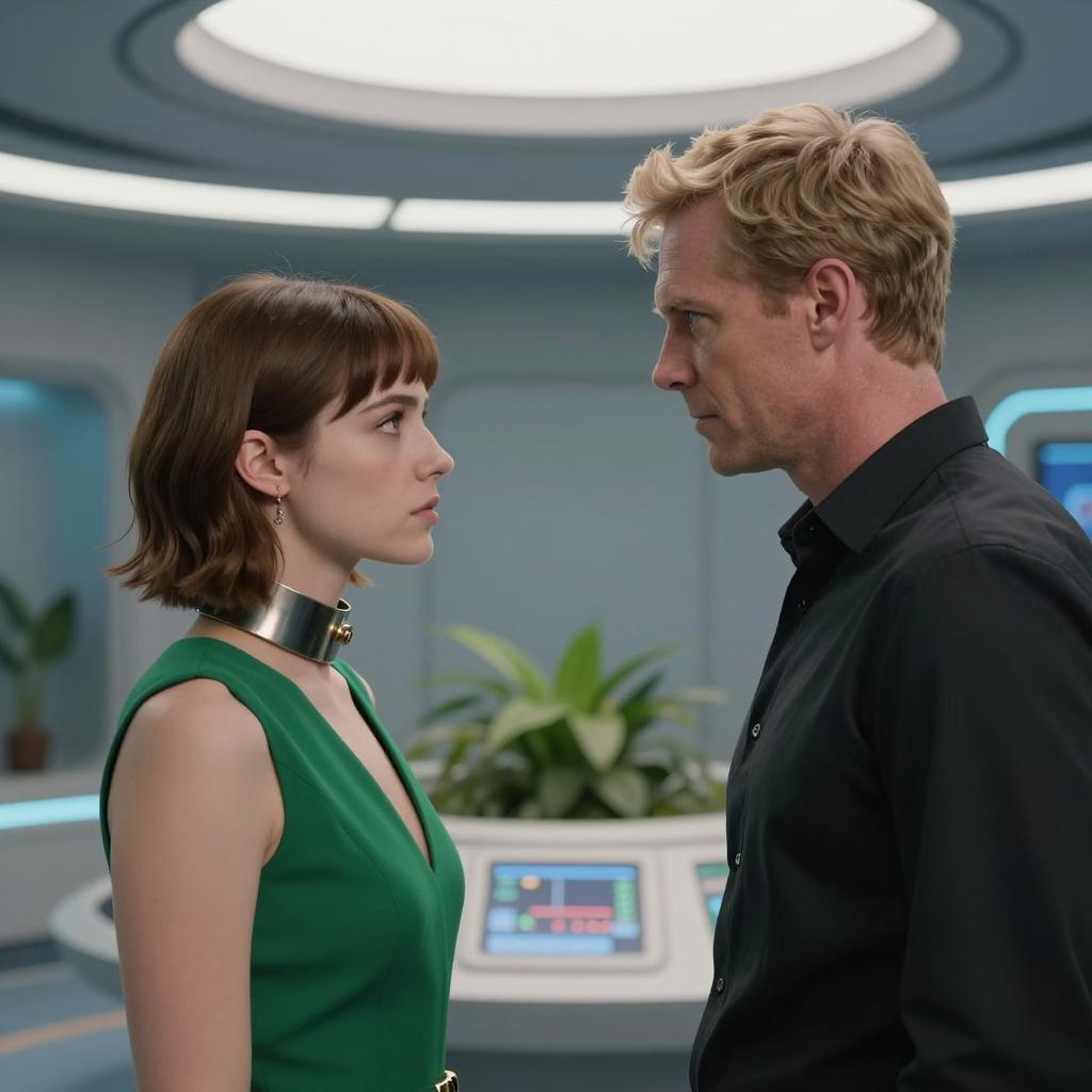 Two people. Red-haired man with tall, spiked hair, green suit, yellow shirt, brown bow tie, stands close to woman with black bob haircut, purple dress, necklace. Woman looks to left, man looks at woman. Background has blurred rocks. Man's face shows mild smile. Both wear jewelry. Man stands slightly behind woman. Two people.