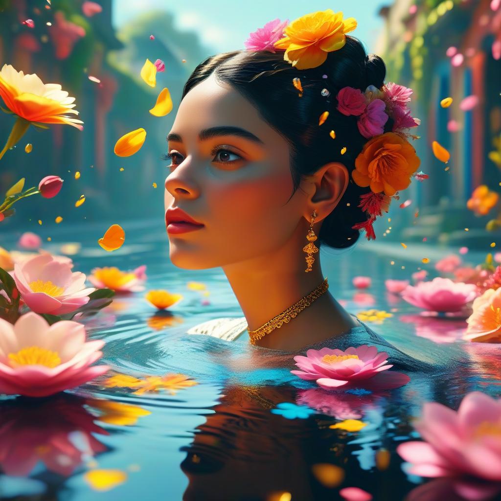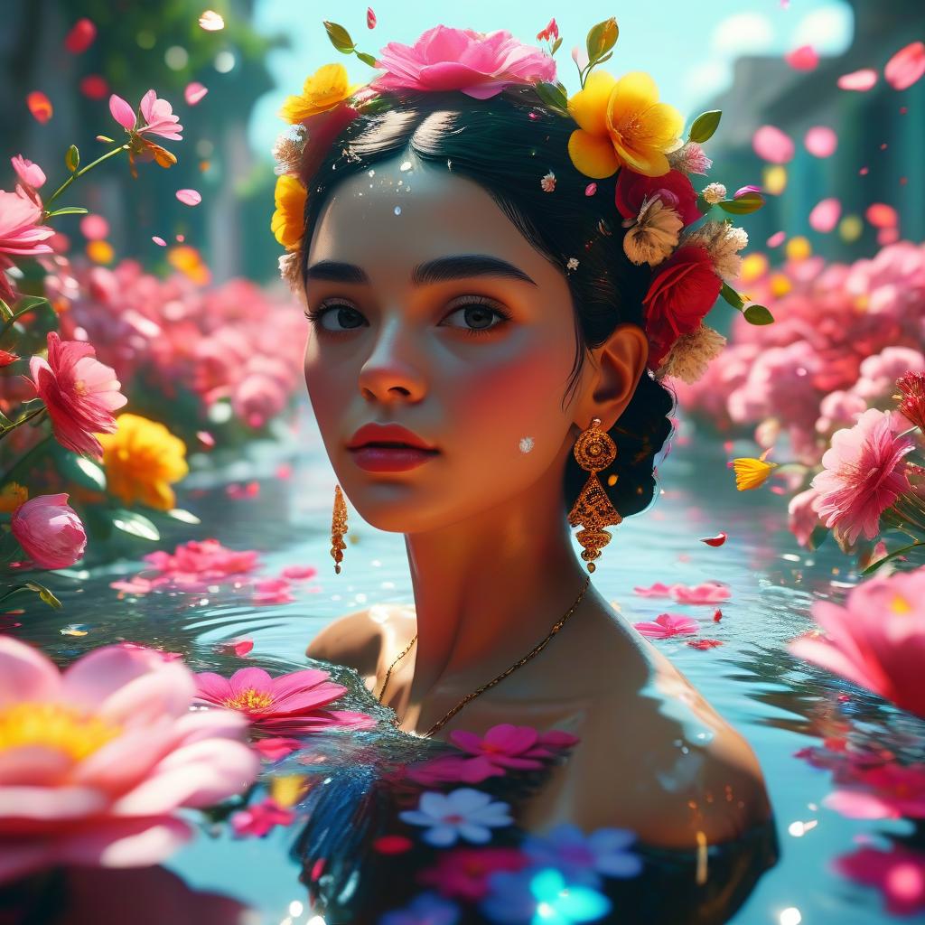 Stunning feminine body, nature scene, enchanting woman from India. Holographic photography shoots, petals floating on water, serene beauty, street pop, luminous palette, close-up, realistic impressionism, shiny/glossy, extreme colorsplash, tranquil landscape of blooming flowers and greenery, around petal splashes, gentle breezes, and soft light. S-curve composition, leading lines, cinematic, in the style of Frida Kahlo, rendered in Unreal Engine, octane render, asymmetrical, golden ratio, petals swirling in the air, intricate detail, model shoot style, dreamlike art, dramatic lighting. 8k, highly detailed, trending on ArtStation.
