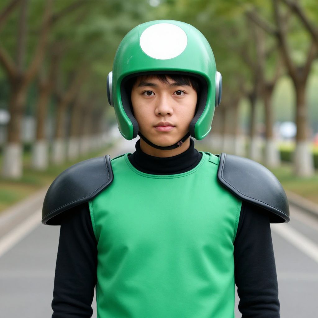 "adult male funny costume, solo, male focus, 1boy, looking at viewer, suspenders, goggles, scarf, closed mouth, buttons, blurry background, helmet Realistic photo of casual sexy person with pretty face"
