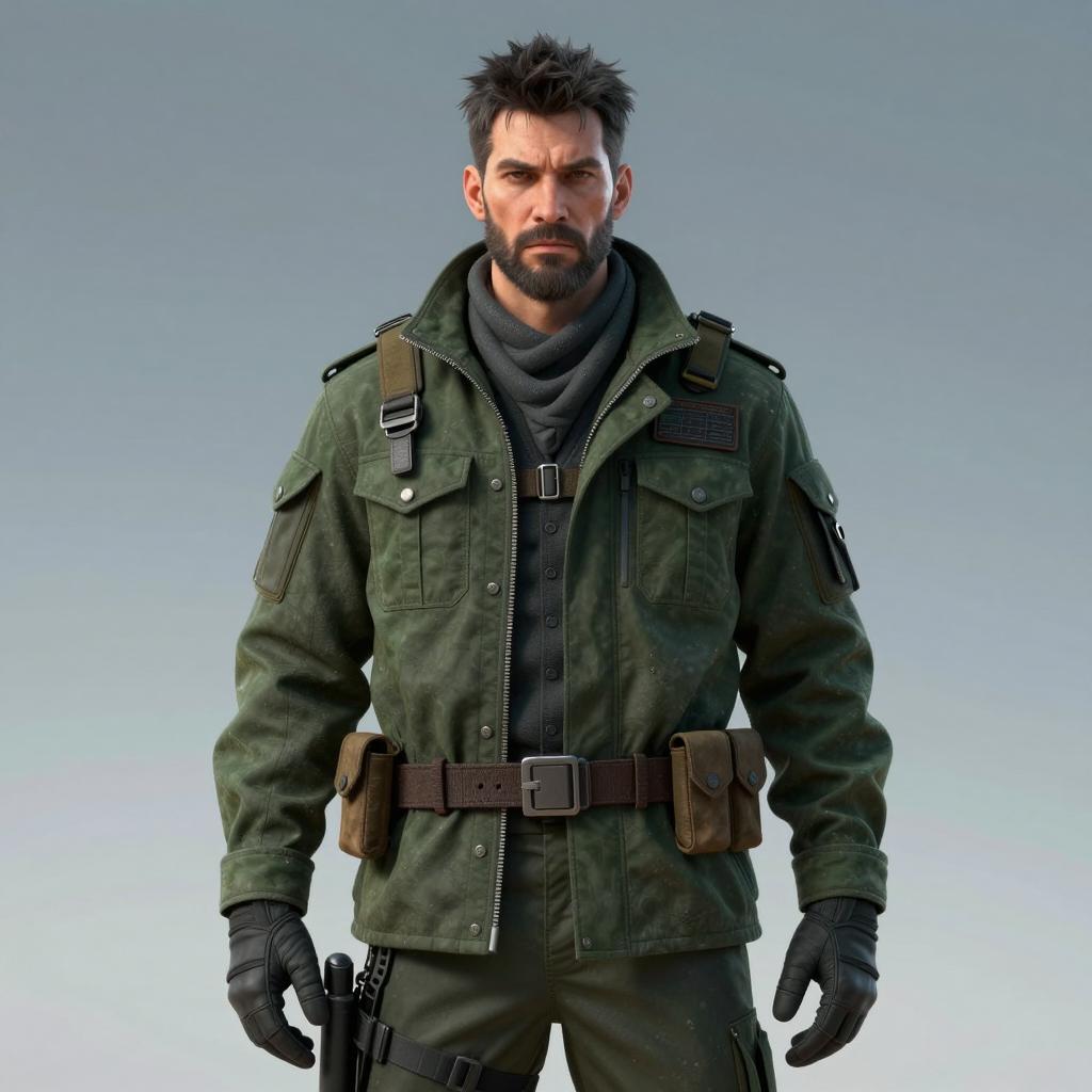Photorealistic 3D rendering of a dark-haired, bearded man with a serious expression wearing a dark green tactical jacket with multiple patches and buttons, a gray scarf, a brown belt with pouches, black gloves, and black pants. The image features realistic lighting and a light blue gradient background, capturing a military style attire with a post-apocalyptic vibe.