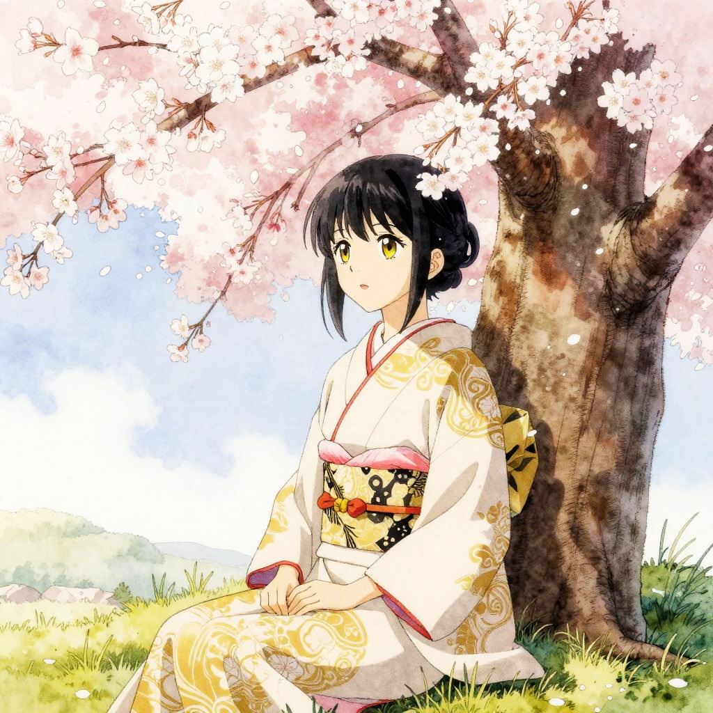 Grey haired anime girl sitting under cherry blossom trees in full bloom, traditional Japanese kimono with intricate patterns, soft pastel background, serene and peaceful