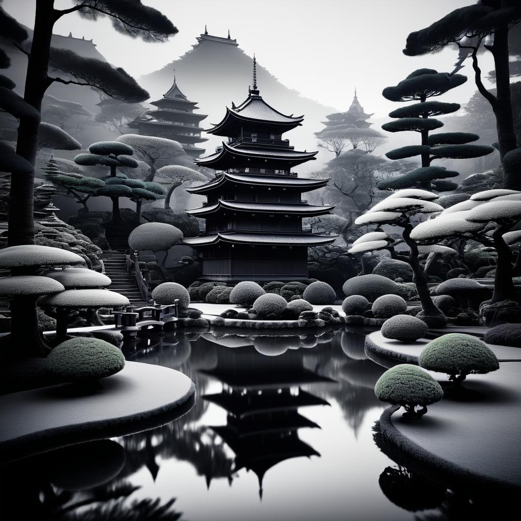 Landscape of a tranquil Japanese garden with a dark fairy castle, mythical and dreamlike, inspired by Hiroshi Sugimoto, Michael Kenna.