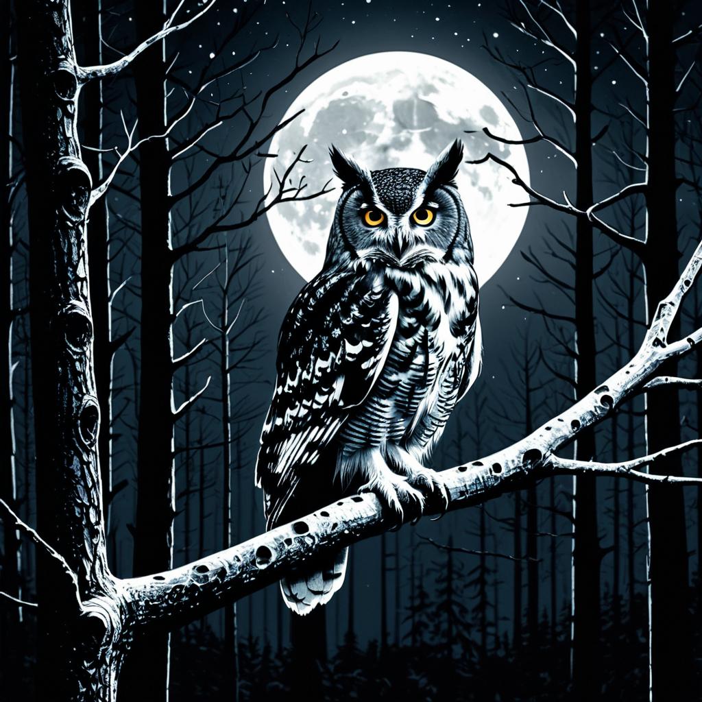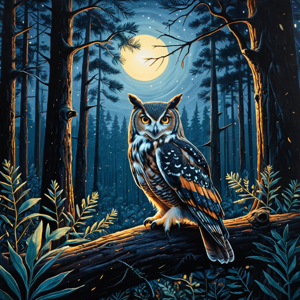 Award-winning painting of an owl perched on a fallen log in a mystical twilight forest. The scene features a richly detailed owl illuminated by moonlight with vivid colors and intricate foliage surrounding it. Tall trees frame the background, creating a serene and magical atmosphere.