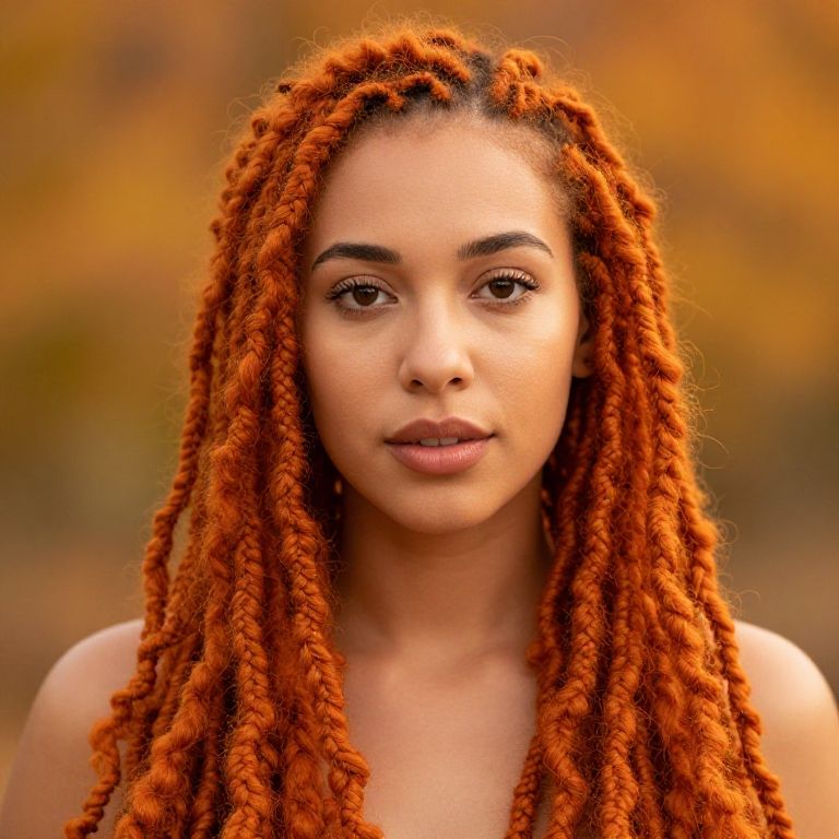 Ginger orange soft locs cascading down shoulders, warm lighting highlighting the rich tones, a serene portrait with natural makeup, soft focus background evoking autumn vibes, detailed texture on each loc emphasizing softness and vibrancy.
