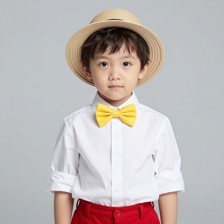 Photograph of an Asian toddler with black hair, wearing a straw hat, white shirt, yellow bowtie, and red pants, against a plain light