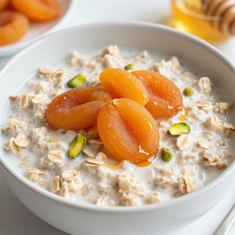A bowl brimming with creamy oatmeal topped with vibrant orange dried apricots, green pistachios, and a subtle drizzle of honey, offering a wholesome and visually appealing breakfast treat.