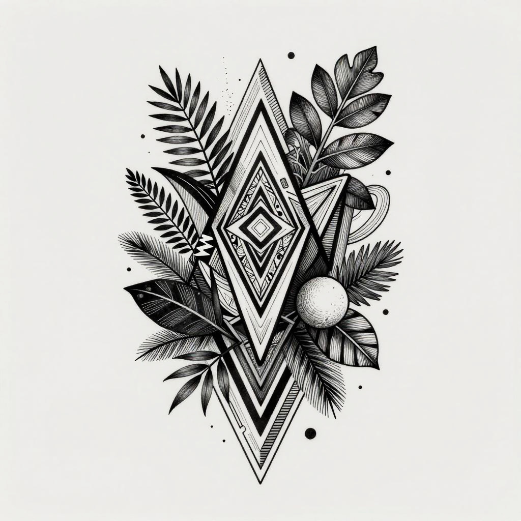 Midjourney tattoo design featuring intricate geometric patterns blending organic nature elements with futuristic shapes, delicate linework and bold shading, set against a minimalistic black and gray background, high detail.