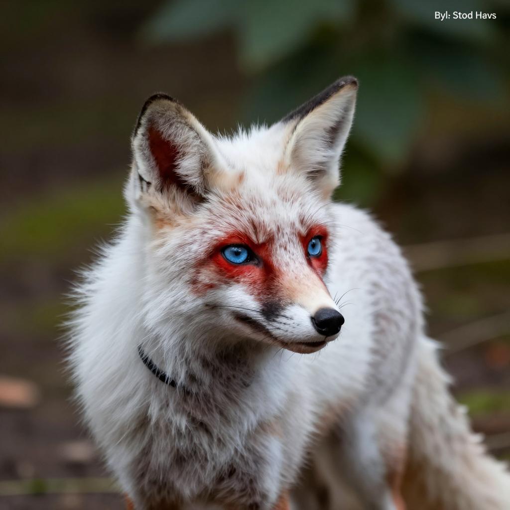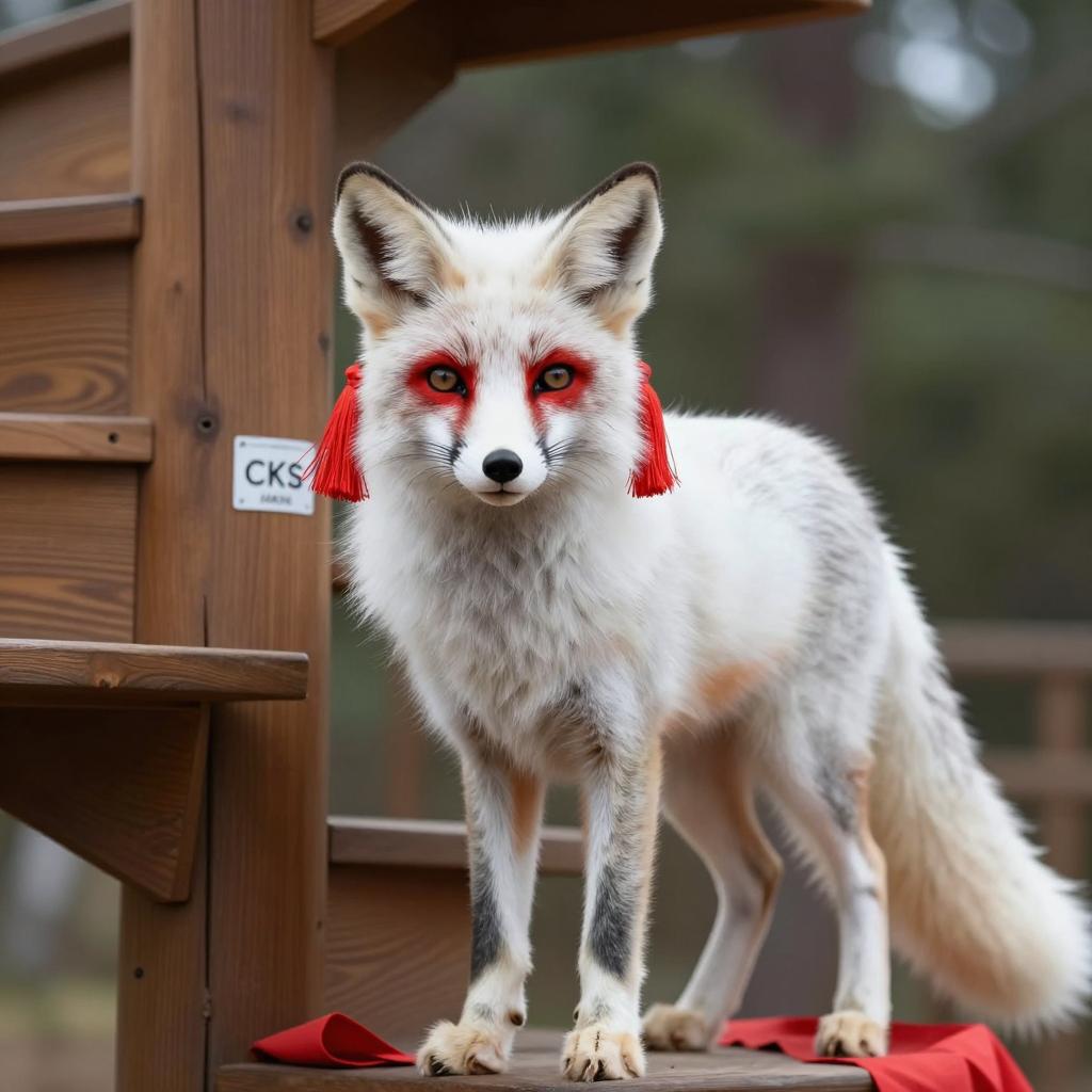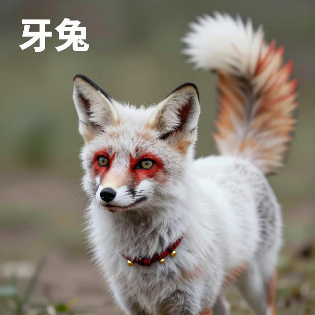 Photograph of a white fox with red markings on ears, face, and tail tip. Fox has fluffy fur, black nose, and green eyes. Wearing a red and black plaid collar with gold beads. Tail raised, showing black and red tip. Background is blurred greenery. Fox's head turned slightly to the left, looking upward. Text in top left corner.
