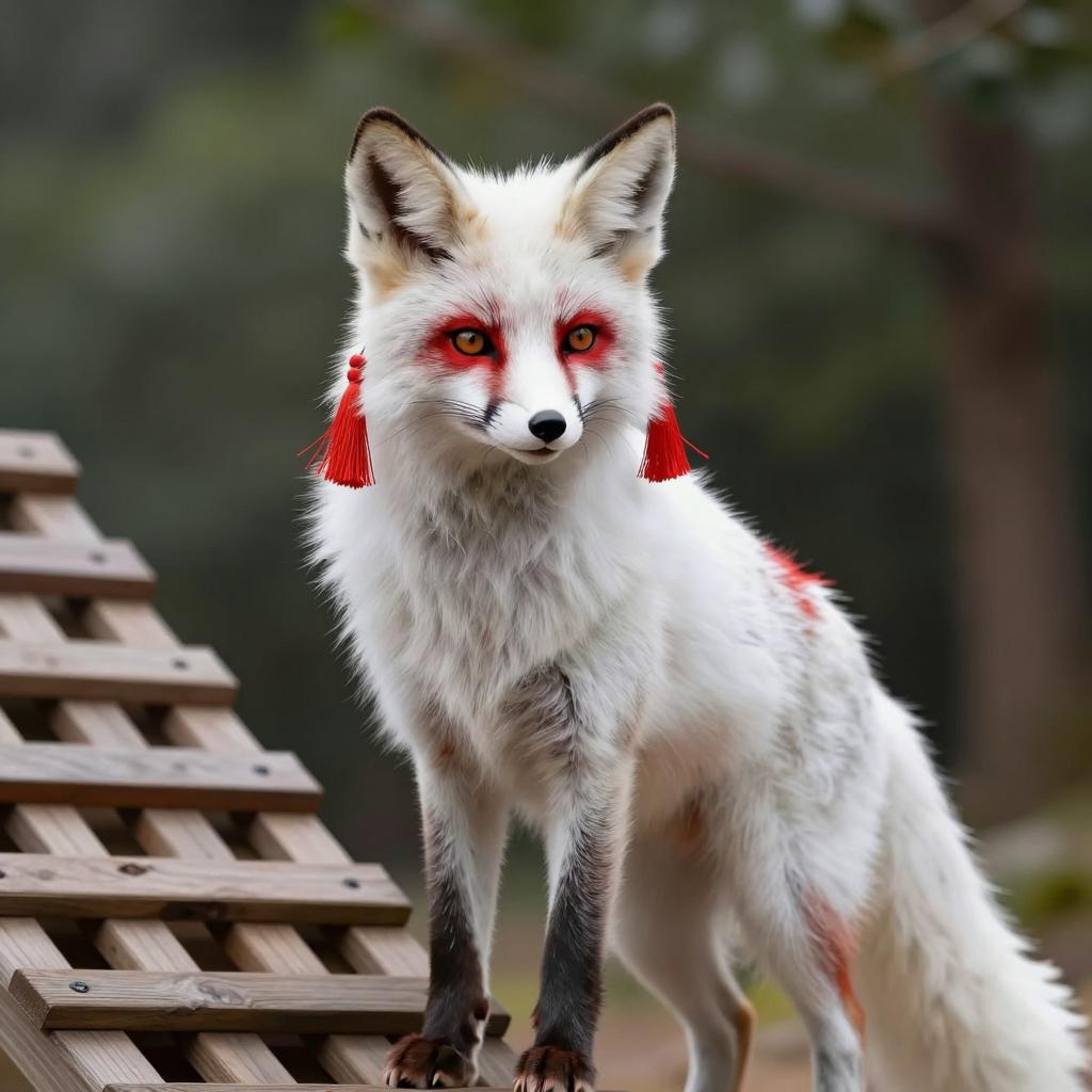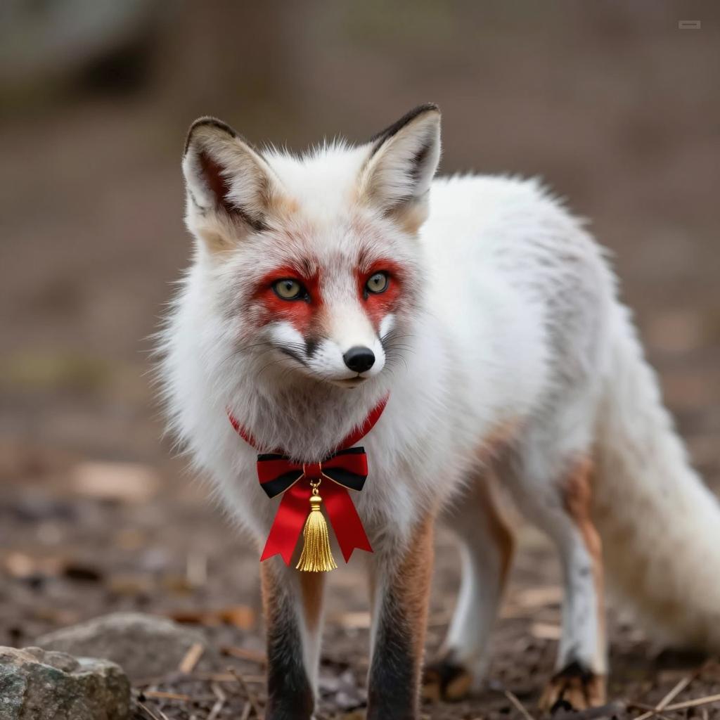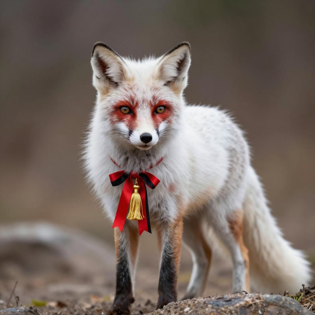Photograph of a white fox with red markings on ears, face, and tail tip. Fox has fluffy fur, black nose, and green eyes. Wearing a red and black plaid collar with gold beads. Tail raised, showing black and red tip. Background is blurred greenery. Fox's head turned slightly to the left, looking upward. Text in top left corner.