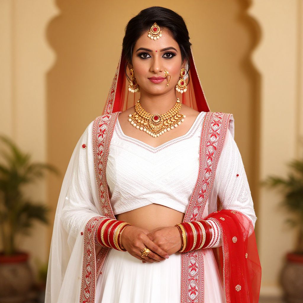 Photograph of a beautiful Indian bride in a red and white saree with gold embroidery, wearing traditional jewelry, standing in an arched courtyard.