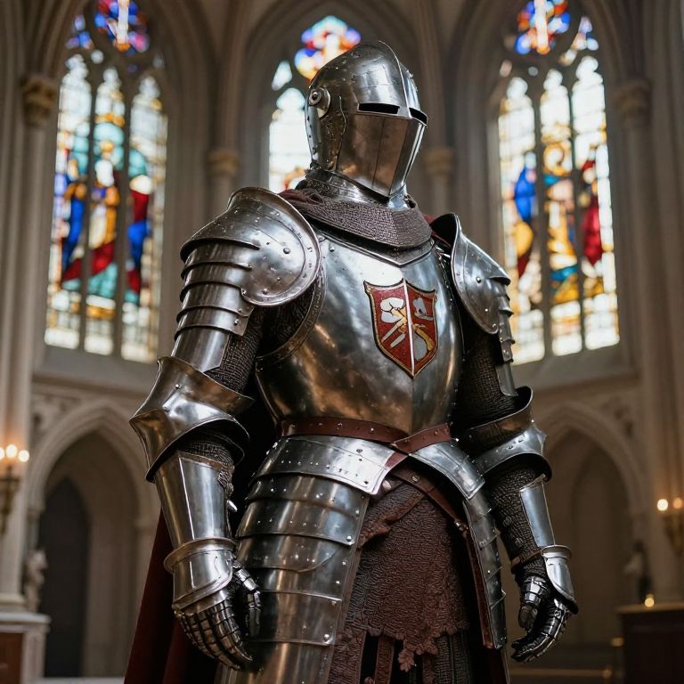 Heavy armor knight in a grand medieval hall, light streaming through stained glass windows, richly detailed armor with heraldic symbols, majestic and stoic pose, high realism