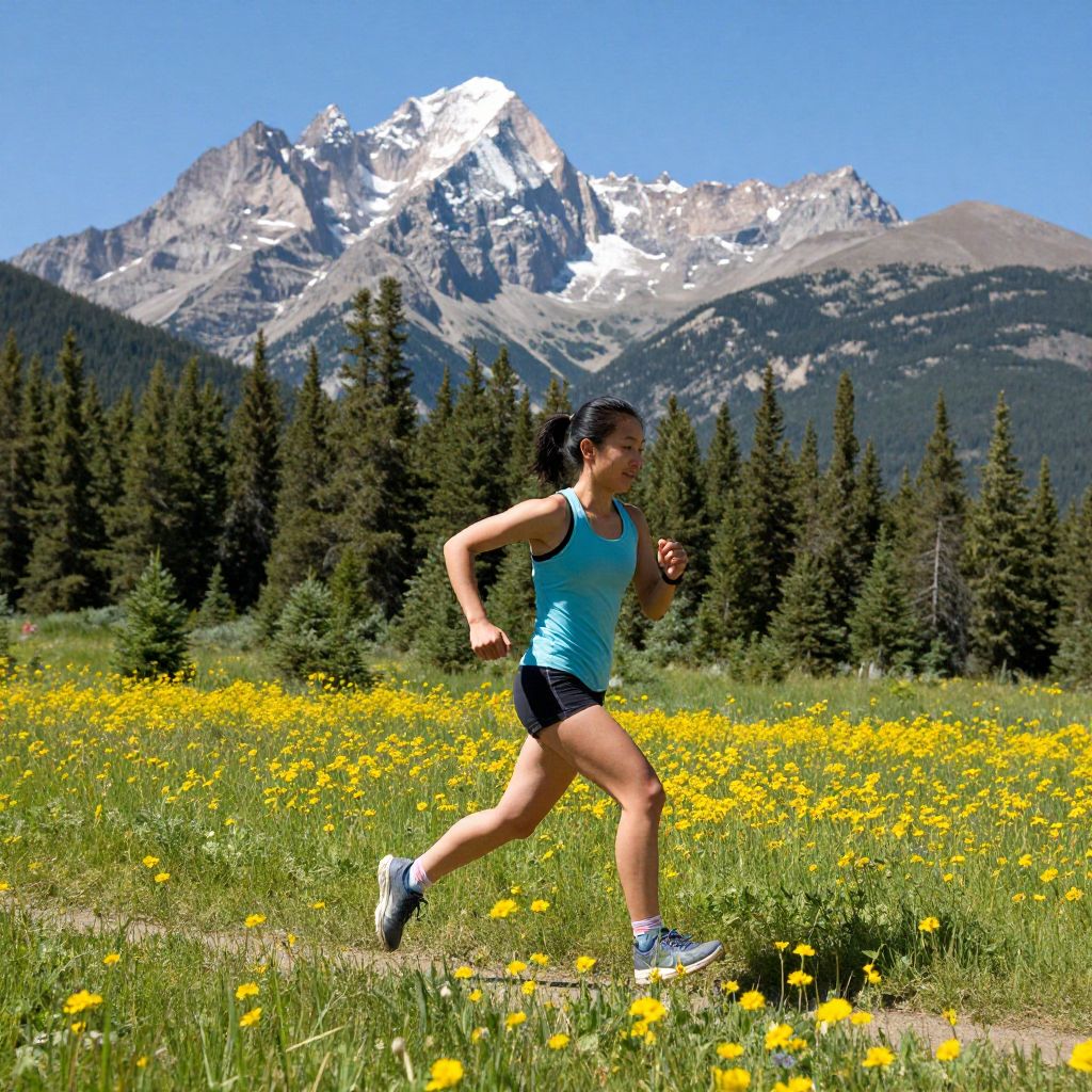 Young Asian woman trail running energetically below majestic Mt Yamnuska, surrounded by vibrant yellow wildflowers and towering evergreen trees in Kananaskis, Alberta, Canada.