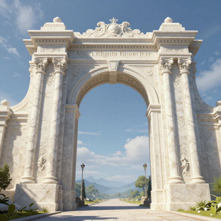 Photorealistic CGI image of a grand, ornate marble archway with intricate carvings and decorative reliefs. The arch is white, with tall, fluted columns and a detailed pediment featuring a crest. Inscribed above the arch is "Nepal Mahanubhav Jatra." The background reveals a clear blue sky, distant mountains, and a pathway leading through the archway. Lush greenery and small plants are visible at the base, with two black lampposts flanking the path. The sunlight casts soft shadows, enhancing the texture and depth of the marble. The overall composition is symmetrical and majestic.