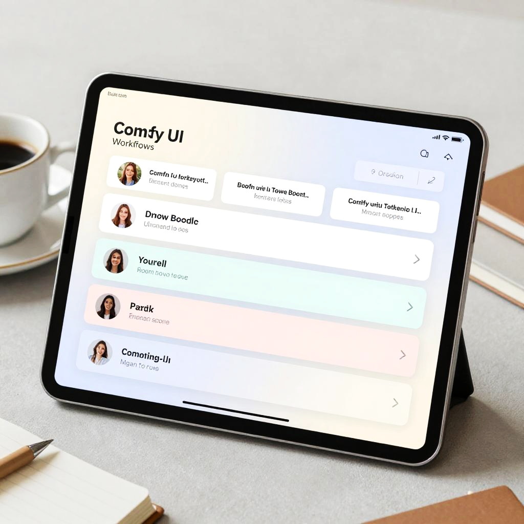 Comfy UI workflows rendered as a modern tablet interface with smooth animations and easy-to-navigate steps, pastel colors with subtle gradients, surrounded by a relaxed workspace including coffee, notebooks, and soft textures conveying comfort and efficiency