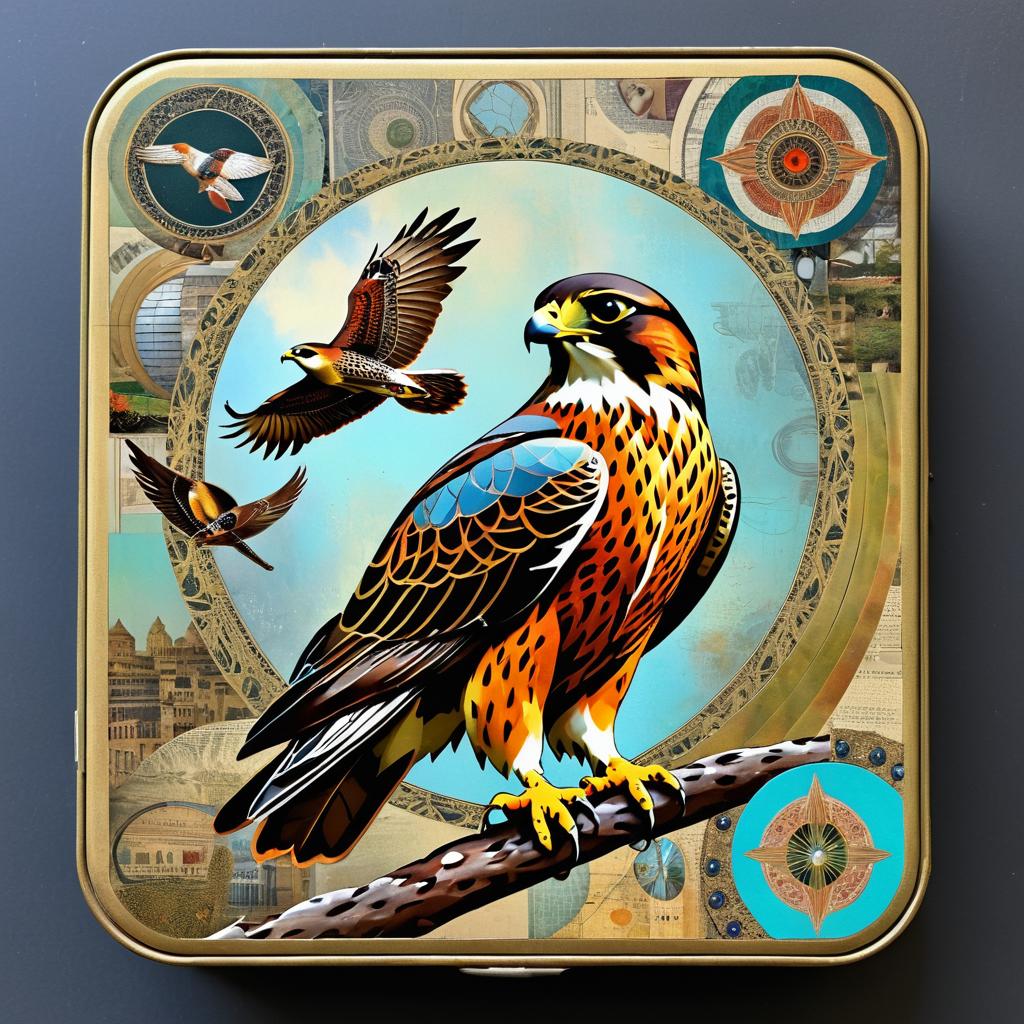 Beautiful collage on a tin box, with no text, polyptych, featuring a beautiful falcon with high detail.