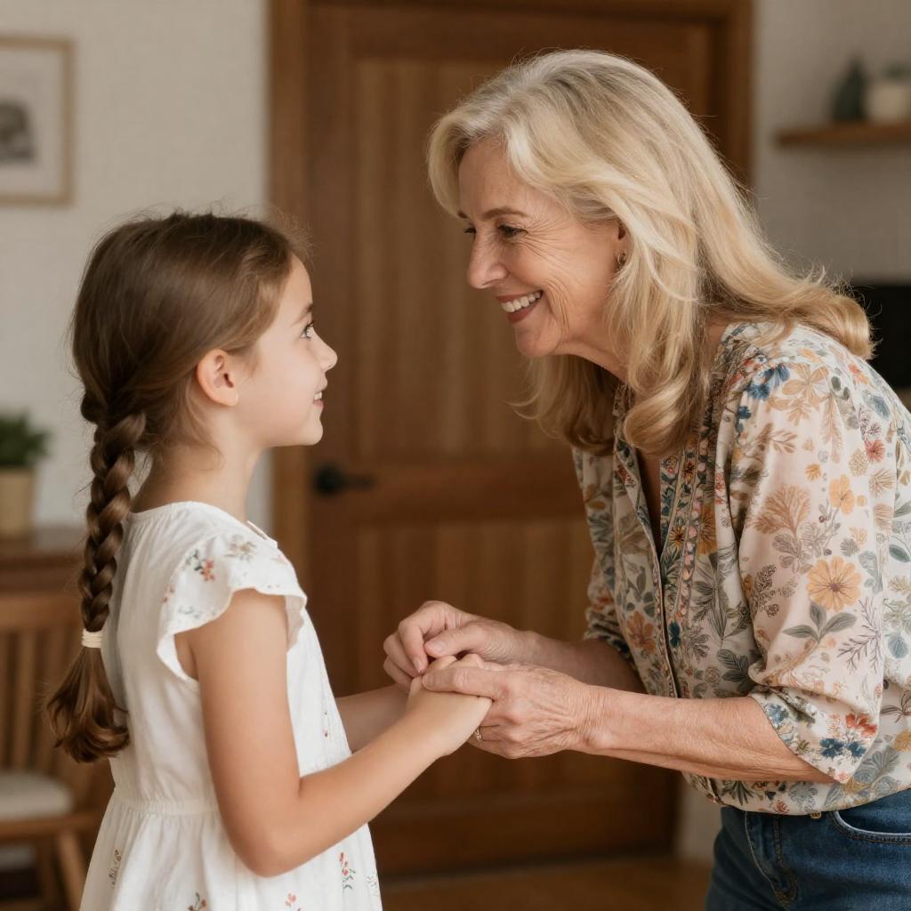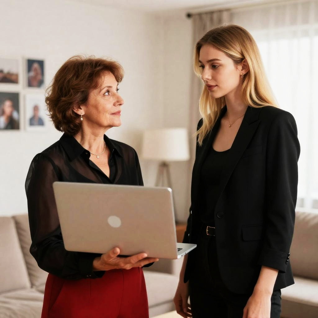 Blonde woman with curly hair, red lipstick, brown jacket, green dress, and light blue handbag, smiling, hands on hips. Elderly woman with short gray hair, light purple blouse, and navy pants, looking at her, smiling. Bright room with white walls, window, and radiator in background.