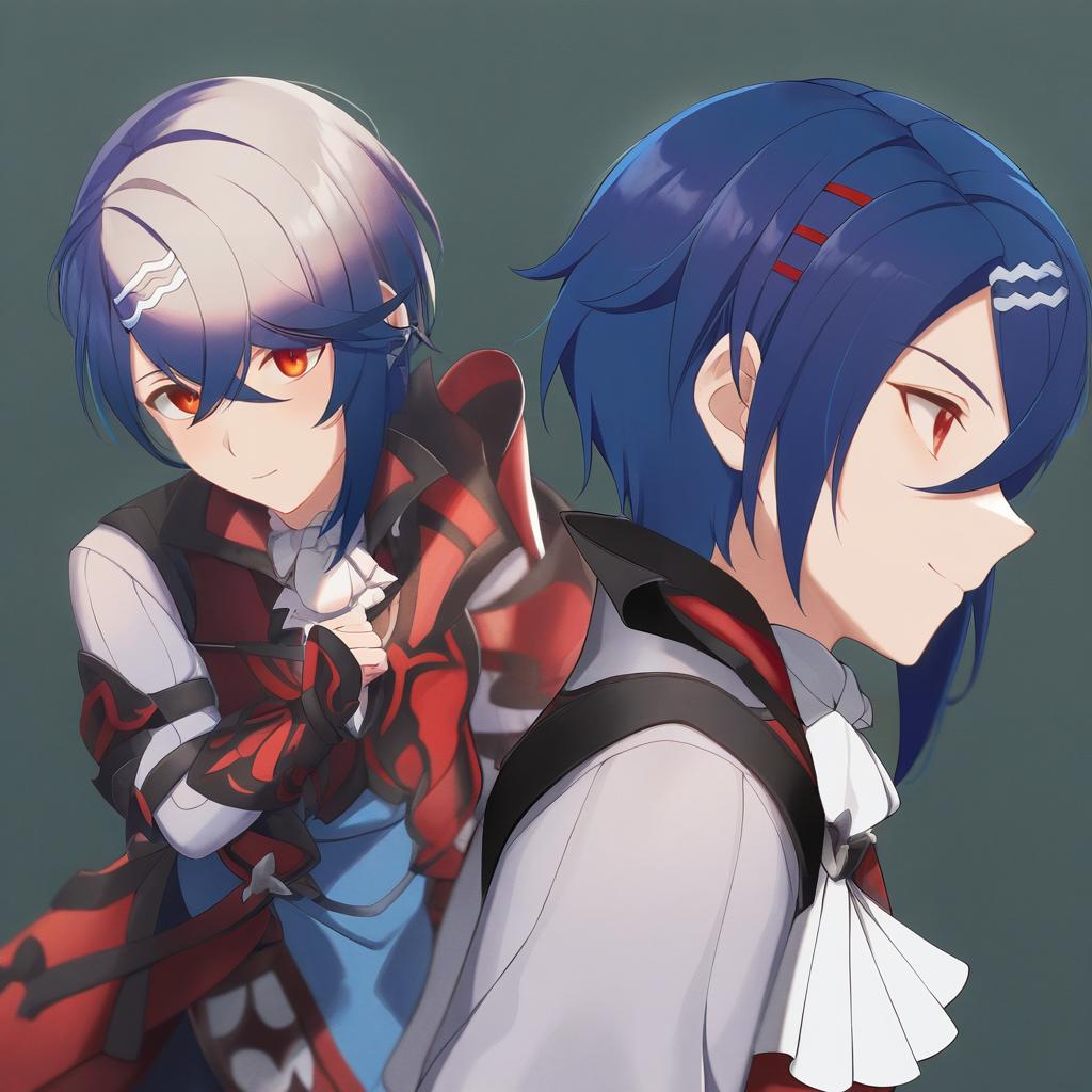 Alcryst (fire emblem), fire emblem, 1boy, red eyes, hair between eyes, short hair, blue hair, asymmetrical hair, hairclip, long sleeves, white ascot, by artist lotosu, leet