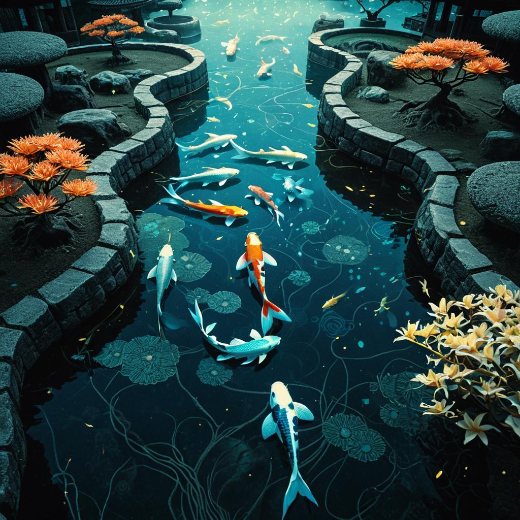 A tranquil circular stone pond in a traditional zen garden, home to several colorful koi fish swimming peacefully. The garden features meticulously pruned bonsai trees and moss-covered rocks arranged around the pond. The water reflects subtle branches and stones beneath its surface, showcasing a serene and harmonious Japanese garden setting with artistic and surreal elements.