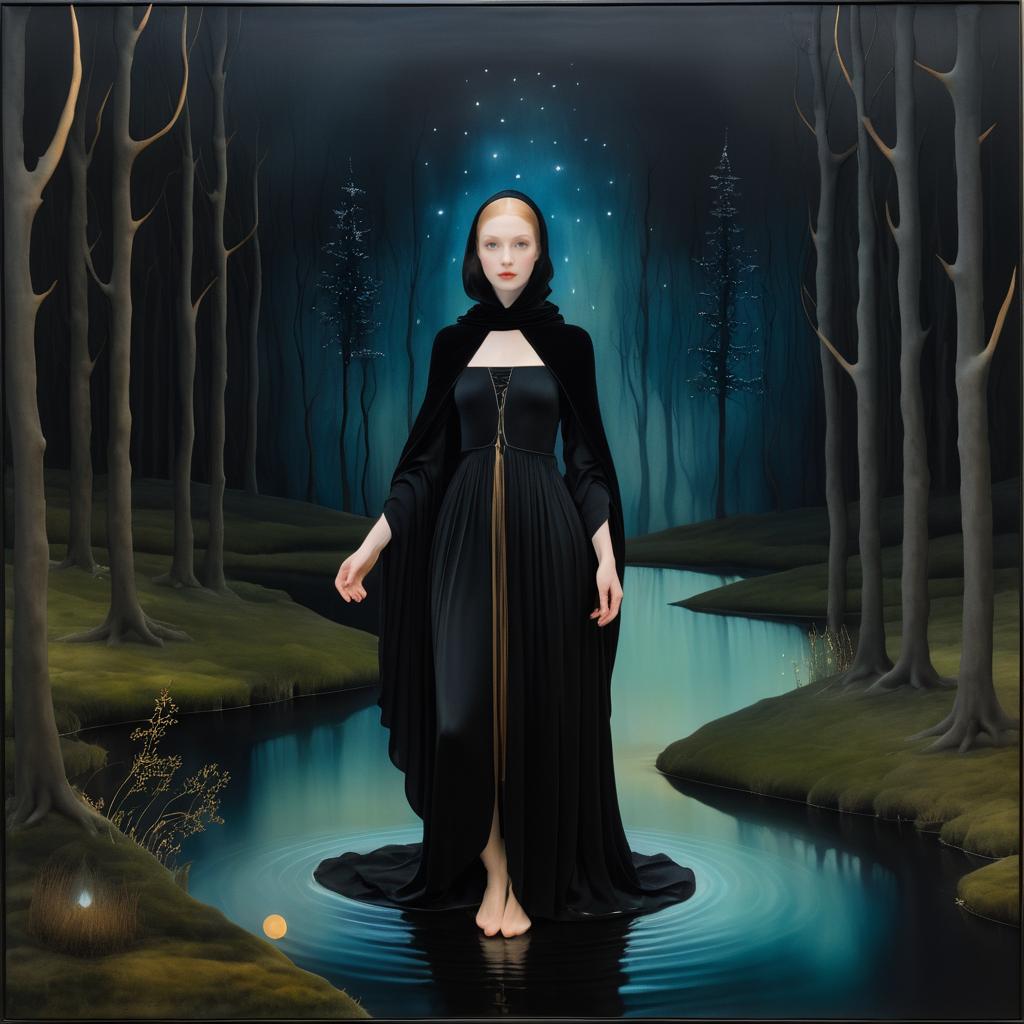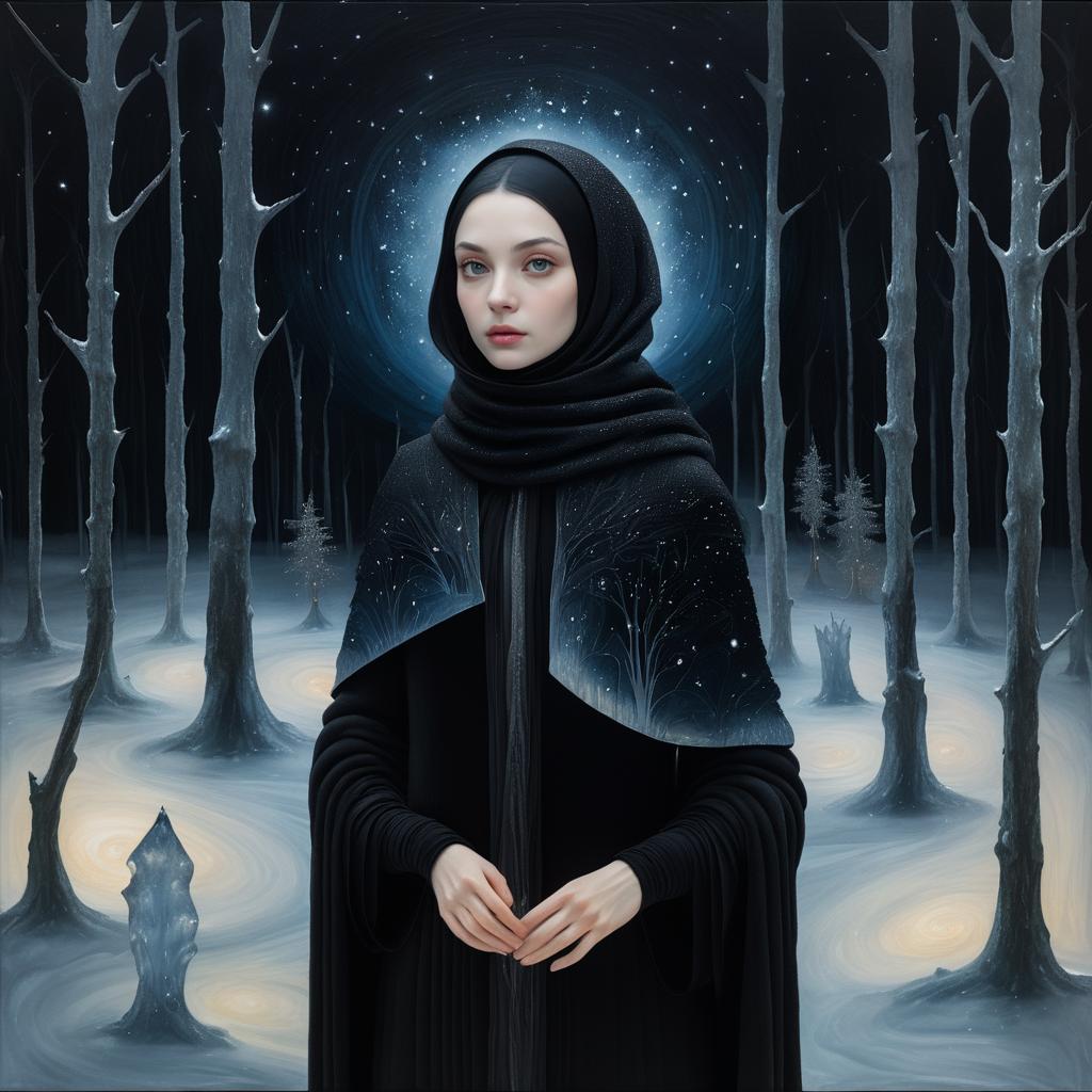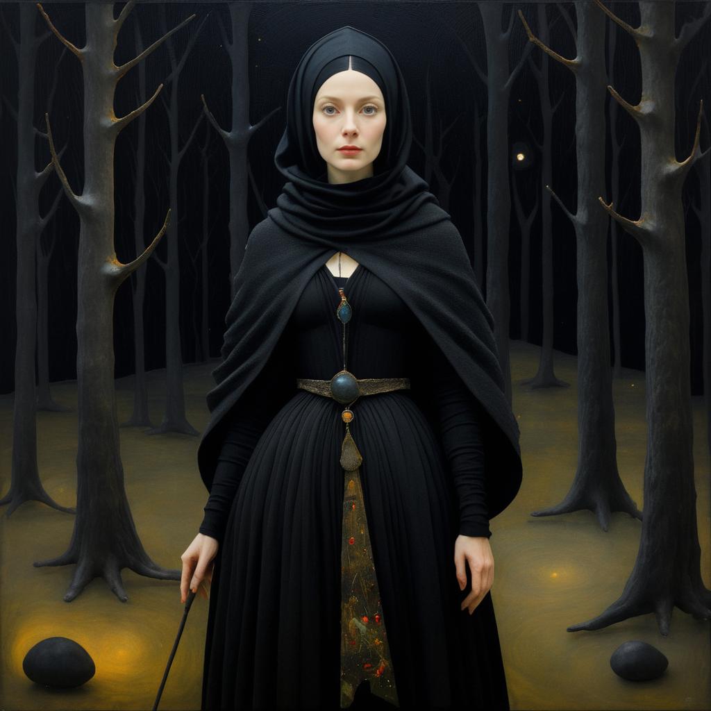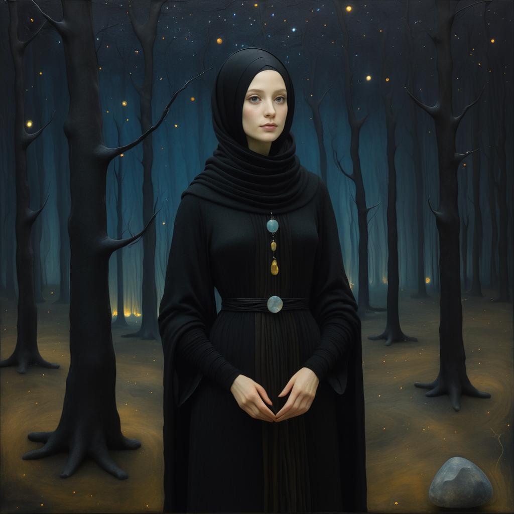 Digital painting of a tall, slim woman with pale skin and a black scarf around her neck, wearing a long black dress adorned with stone-textured ornaments. She stands solemnly in a dark, eerie forest at night, illuminated by subtle glowing lights resembling fireflies. The scene evokes a mystical and surreal atmosphere inspired by the style of Hieronymus Bosch.