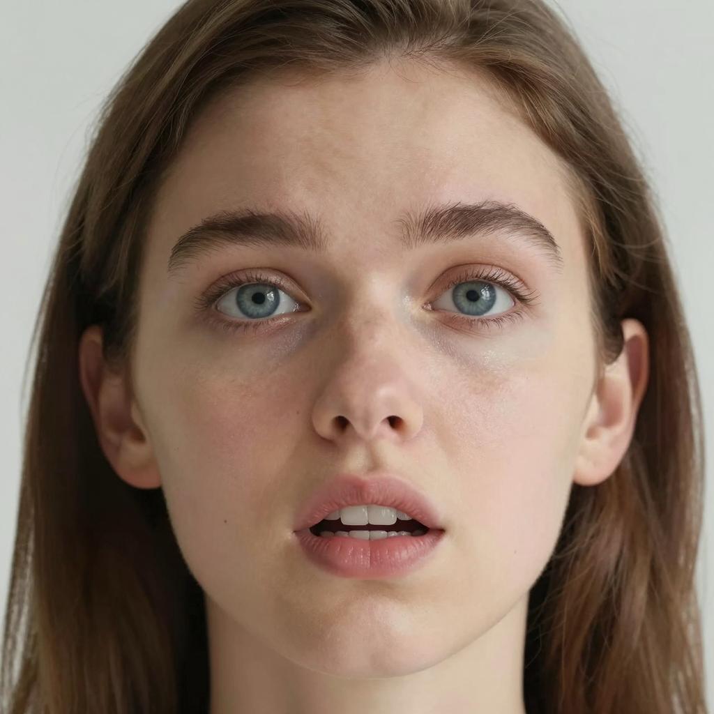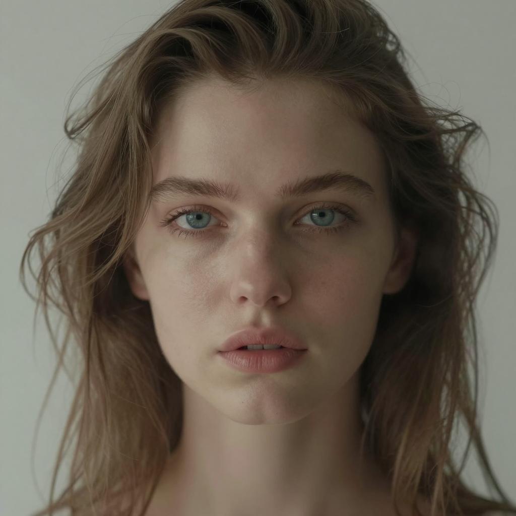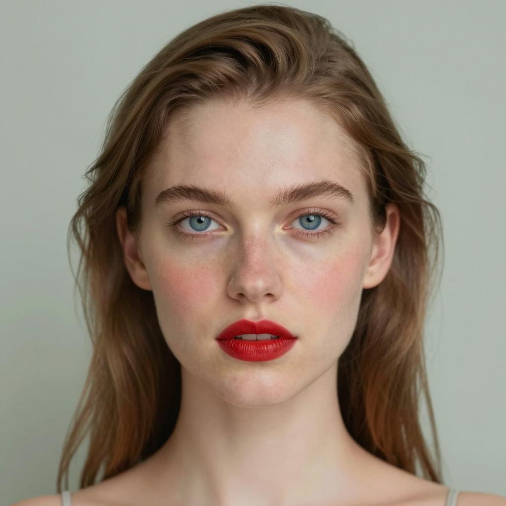 A fair-skinned woman with blue eyes, light brown hair, and red lipstick. She has subtle makeup, slightly flushed cheeks, and a neutral expression. Background is blurred and light green. She is centered in the frame.